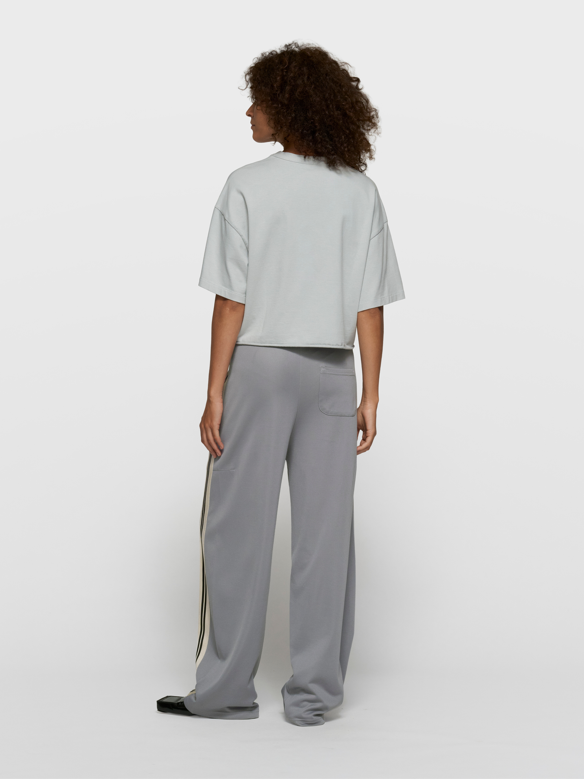 Mit einer soften Trackpants oder einer weit geschnittenen Stoffhose entsteht ein entspannter, urbaner Stil. Eine leichte Trainingsjacke ergänzt das Outfit funktional. Helle Sneaker oder minimalistische Slides greifen die sportive Klarheit des Shirts auf.