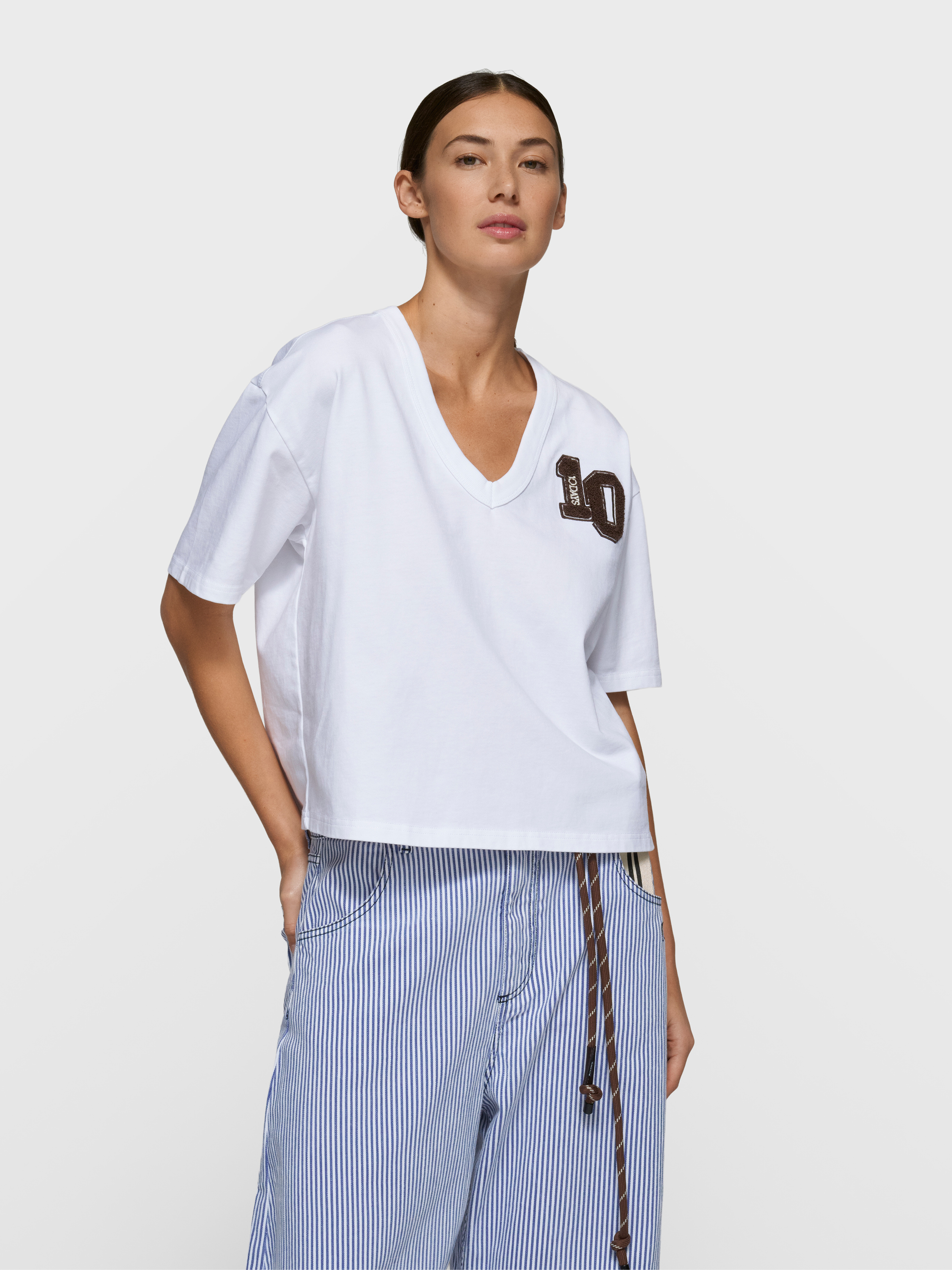 Klare Linien und ein sportiver Akzent prägen dieses V-Neck T-Shirt von 10 Days. Die weiche, GOTS-zertifizierte Bio-Baumwolle sorgt für ein angenehmes, natürliches Tragegefühl und eine ruhige, hochwertige Optik. Der feminine V-Ausschnitt verleiht der Silhouette Leichtigkeit, während der Frottee-Baseball-Aufnäher mit der Nummer 10 auf der Brust einen markanten, dennoch stilvollen Kontrast setzt. Die feine „Mini Stripes“-Stickerei auf dem Rücken rundet das Design mit einem dezenten Signature-Detail von 10 Days ab.