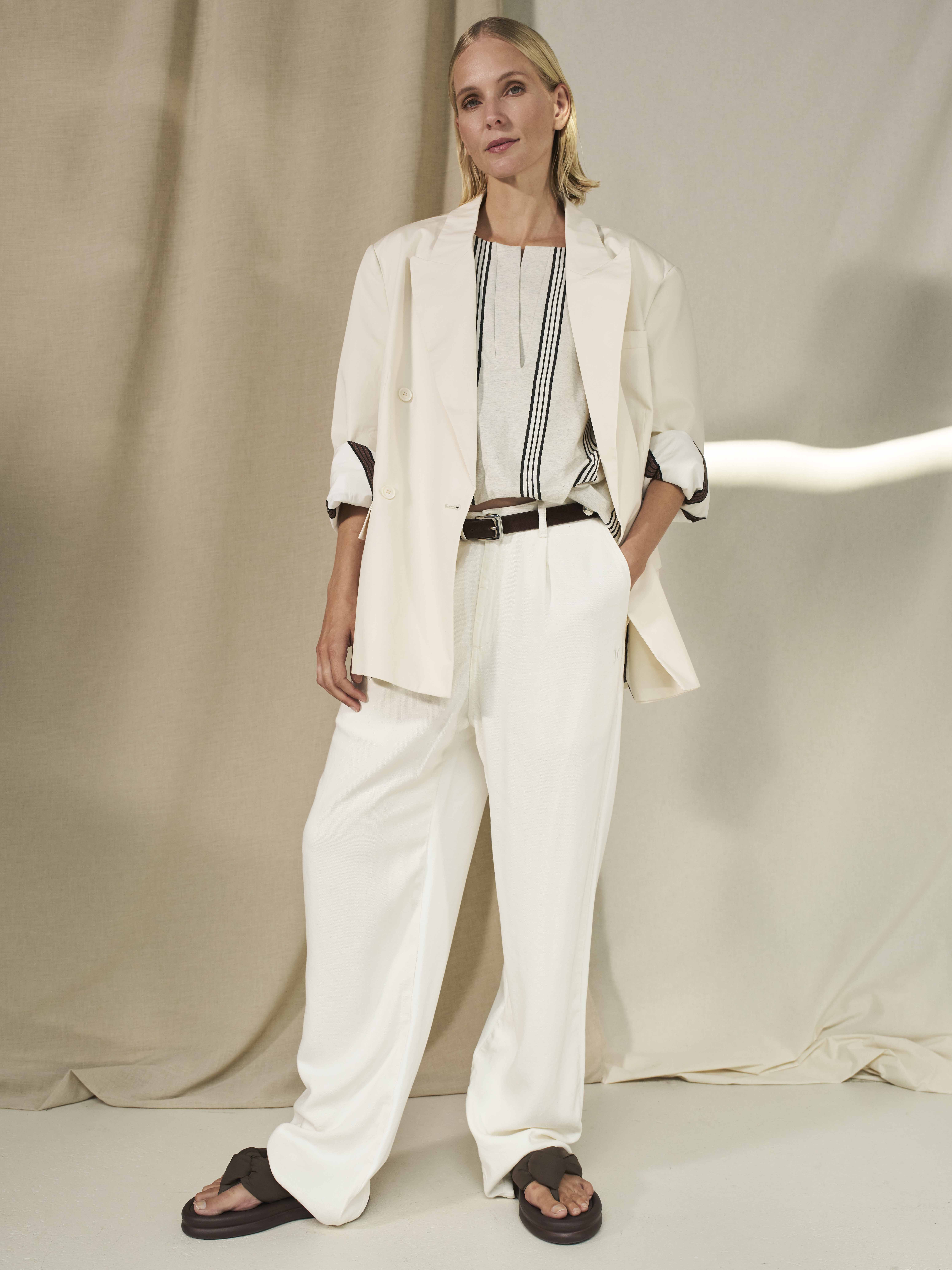 Ein Blazer mit klarer Linie und bewusst großzügiger Silhouette. Der Oversized Fit von 10 Days ist so konzipiert, dass er locker und leicht überdimensioniert sitzt – inspiriert von einem Look, als wäre er aus dem Kleiderschrank des Partners geliehen. Feiner Krepp, Schulterpolster und klassischer Reverskragen geben Struktur, während Soft Vanilla Ruhe in die Erscheinung bringt und vielseitige Kombinationen ermöglicht.