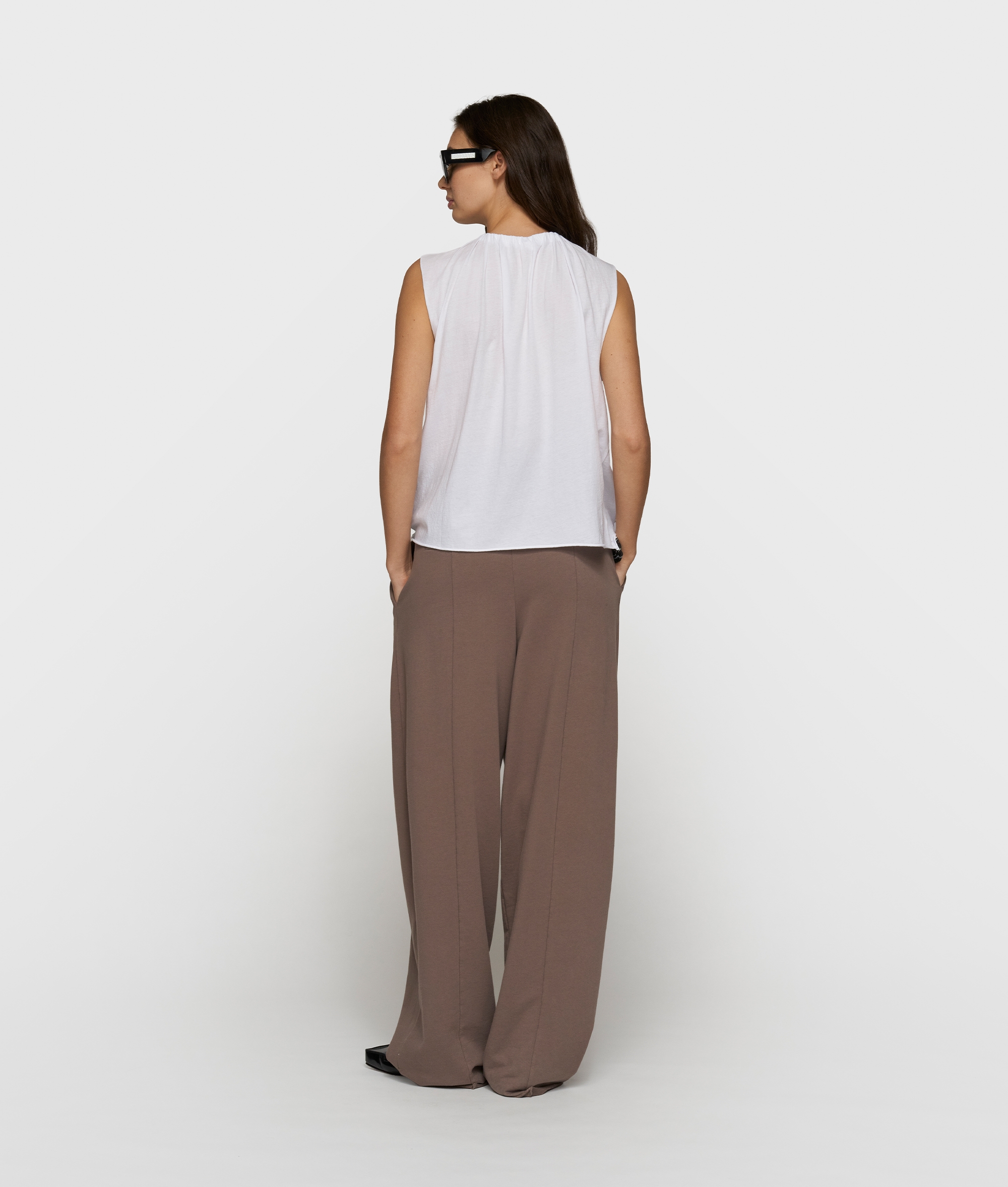 Ein ärmelloses Top in klarer, fließender Silhouette, das durch seine feine Struktur und die ruhige Leichtigkeit besticht. Der gesmokte Rundhalsausschnitt erzeugt eine sanfte Weite, während die offenen Abschlüsse den entspannten Charakter unterstreichen. Gefertigt aus GOTS-zertifiziertem Bio-Baumwolljersey, verbindet das Design von 10 DAYS mühelose Modernität mit einem angenehm soften Tragegefühl.