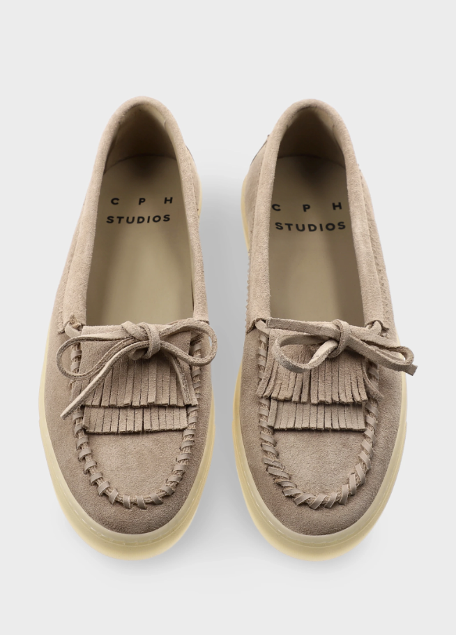Der Segelschuh CPH365 in Sand verbindet eine klare Slip-On-Silhouette mit weichem Suede und fein ausgearbeiteten Mokassin-Details. Schleife, Fransen auf der Zunge und die rund zulaufende Zehenpartie verleihen dem Modell eine ruhige, lässige Ausstrahlung mit besonderer Tiefe. Die flache Sohle und das dezente Branding auf der Innensohle unterstreichen den reduzierten Look von Copenhagen Studios.