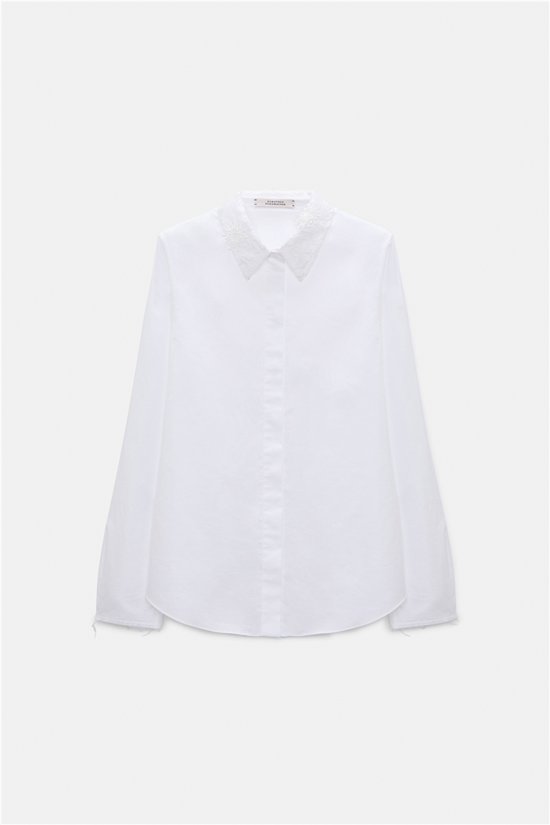 Eine klare Bluse mit feinem Detailfokus. Die schmale Silhouette wirkt ruhig und präzise, während der bestickte Blütenkragen dem Design eine subtile, feminine Note verleiht. Verdeckte Knöpfe sorgen für eine saubere Front, der leicht ausgefranste Saum am Ärmel setzt einen bewussten Kontrast zur klaren Linienführung. Ein modernes Essential von Dorothee Schumacher, das Leichtigkeit und Stärke selbstverständlich verbindet.