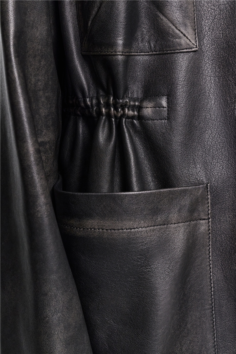 Besonders schön wirkt die Jacke im Stil-Mix: zu Minirocken, feinen Schluppenblusen, Seidentops oder kleinen Kleidern entsteht ein spannender Kontrast zwischen der derberen Lederoptik und zarten, femininen Materialien. Wer den Look etwas markanter mag, kombiniert sie mit einem Rollkragenpullover oder einem feinen Cashmere-Knit. Eine Jacke, die durch ihren hochwertigen Charakter und ihre Vielseitigkeit zu einem echten Statement-Piece wird.