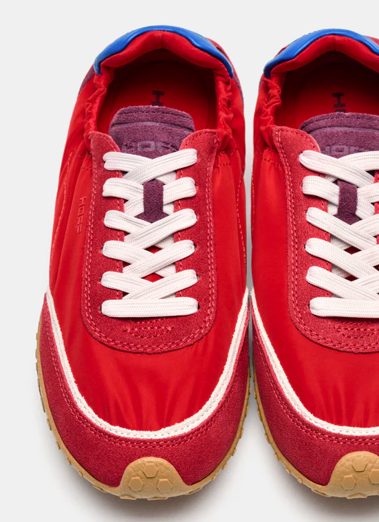 Der Sneaker „Bridge“ von HOFF verbindet sportliche Leichtigkeit mit einem klaren, modernen Design. Nylon mit dezentem Satin-Finish trifft auf weiches Veloursleder und erzeugt eine ruhige, hochwertige Oberfläche mit feiner Struktur. Die handschuhähnliche Konstruktion wirkt bewusst minimalistisch: weich, unstrukturiert und besonders flexibel. So passt sich der Schuh natürlich an den Fuß an und begleitet jeden Schritt mit spürbarem Komfort. Der elastisch geraffte Kragen im charakteristischen Rock-and-Roll-Finish erleichtert das Hineinschlüpfen und verstärkt das leichte, unkomplizierte Tragegefühl. Geprägte und injizierte Logo-Details setzen dabei dezente Markenakzente.