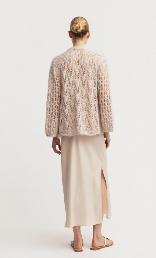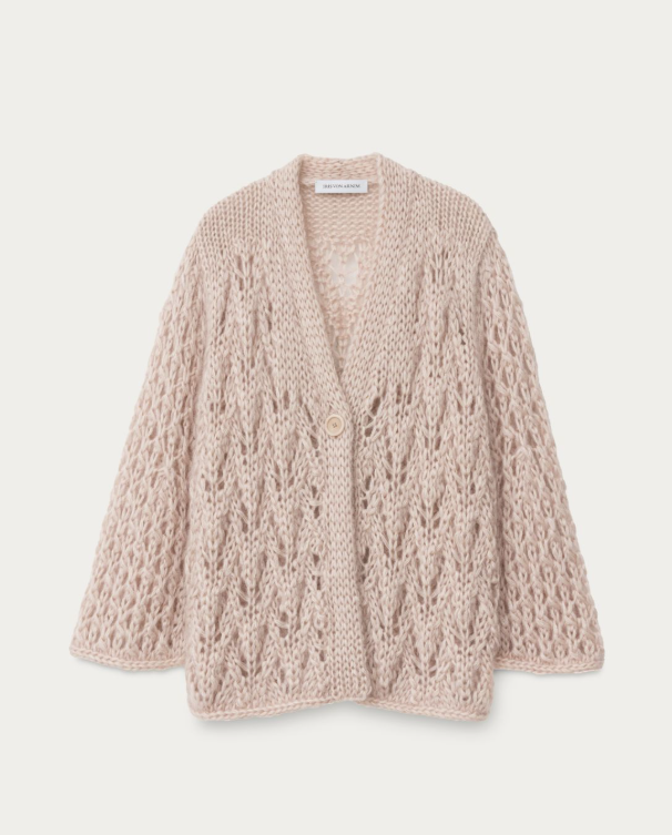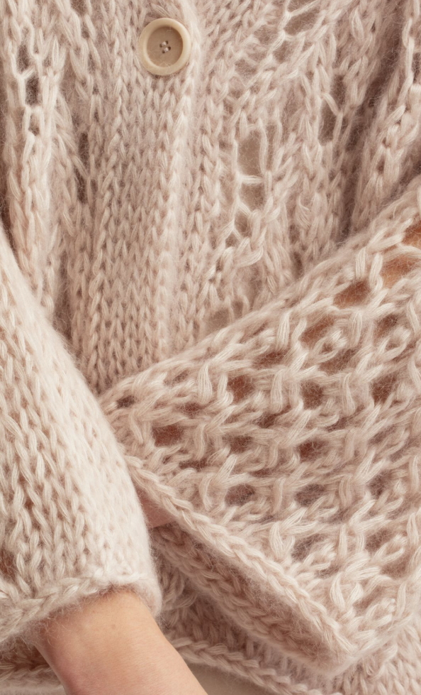 Der Cardigan wird von Hand gestrickt – jedes einzelne Stück ist ein Unikat. Der V-Ausschnitt, die Raglan-Ärmel und die offene, leicht transparente Strickoberfläche unterstreichen den luxuriösen Charakter. Geschlossen werden kann das Modell dezent mit einem einzelnen Knopf.