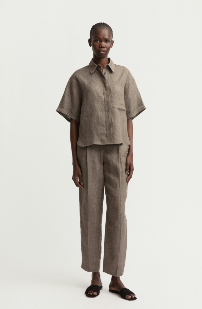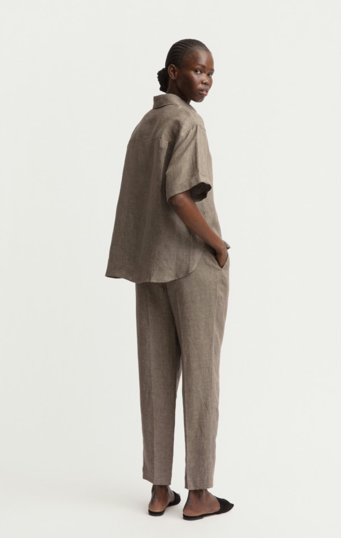 In Kombination mit der Santorini Leinenhose entsteht ein ruhiges, stimmiges Set aus fließenden Silhouetten und natürlichen Nuancen. Die abgestimmte Farbwelt wirkt besonders harmonisch und bringt die besondere Struktur des Leinens zur Geltung. Schlichte Sandalen ergänzen den Look klar und unaufgeregt.