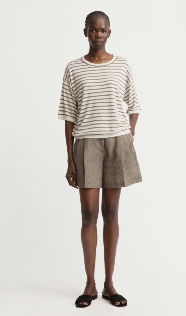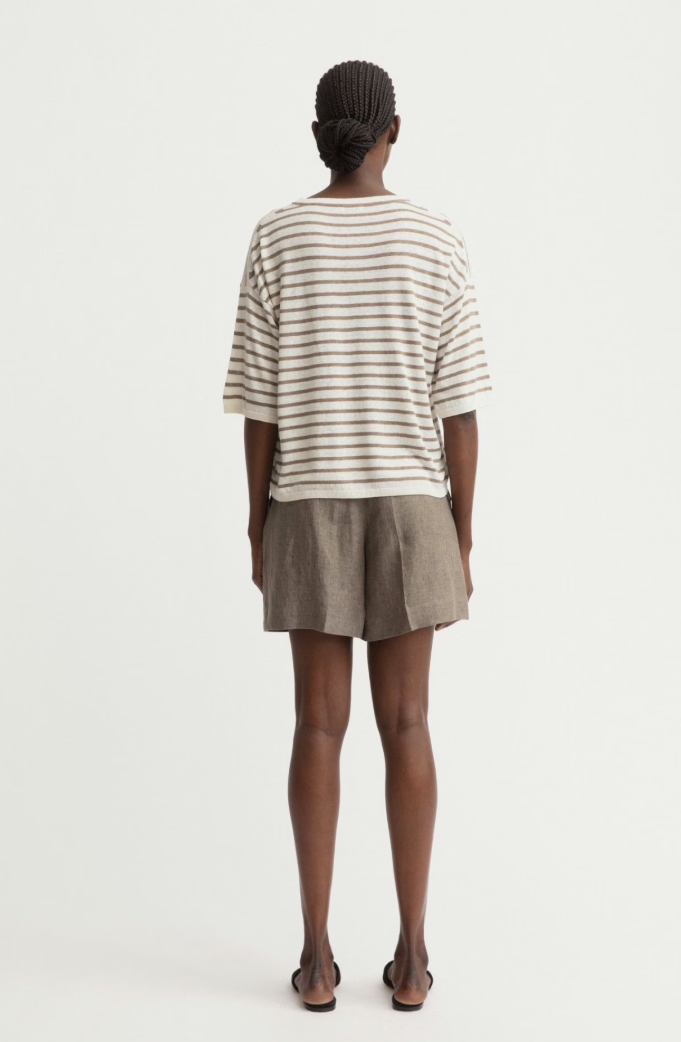 Feine Streifen in ruhiger Taupe-Weiß-Nuance prägen den entspannten Charakter dieses Rundhalspullovers von Iris von Arnim. Die weiche, leichte Qualität aus Seide und Leinen verleiht dem Modell eine natürliche Struktur und ein luftiges Tragegefühl. Der lockere Schnitt mit überschnittenen Schultern unterstreicht die mühelose Silhouette und bringt eine leise, moderne Lässigkeit in den Look.