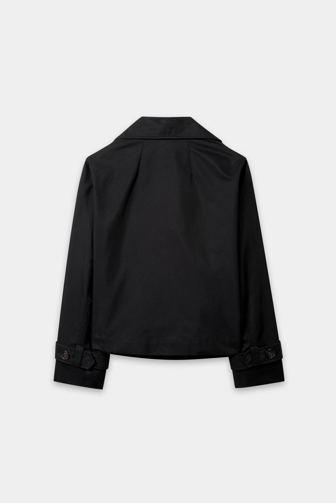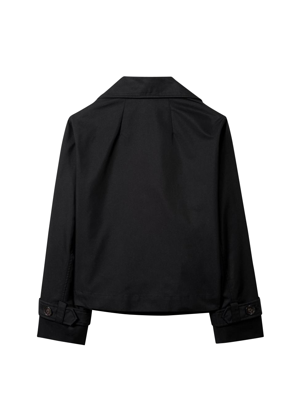 Kurze, modern interpretierte Trenchjacke von Luisa Cerano aus robustem Autogabadin in hochwertiger Baumwollmischung. Der markante Reverskragen und die doppelreihige Knopfleiste verleihen der Jacke ihren klassischen Charakter. Stilvolle Details wie zwei seitliche Taschen sowie verstellbare Riegel an den Ärmelabschlüssen unterstreichen den eleganten Look. Die Knöpfe sind aus edlem Horn gefertigt. Ein vielseitiges Keypiece für gehobene Everyday-Looks.