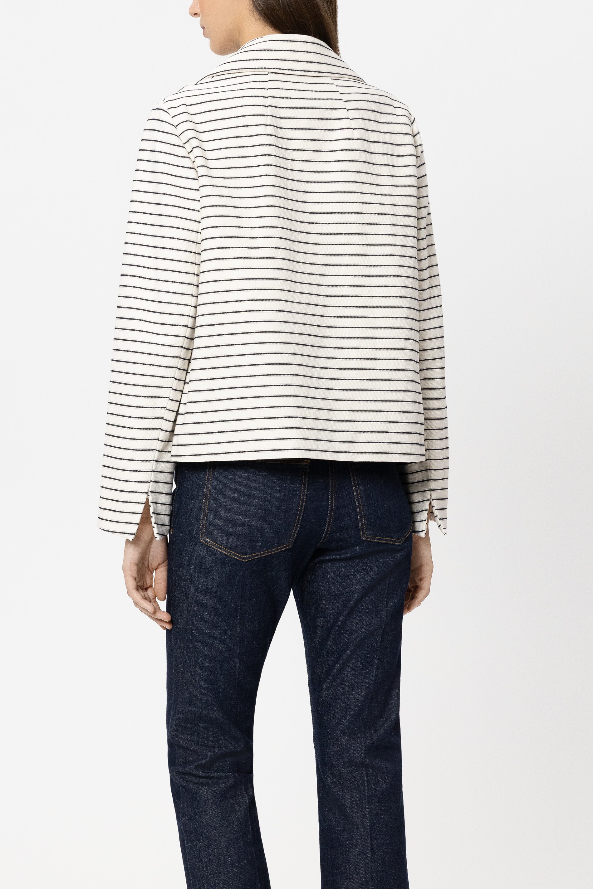 Diese verkürzte, doppelt gereihte Cabanjacke von Luisa Cerano interpretiert den maritimen Look modern und feminin. Das feine Streifendesign, der breite Reverskragen und die komplett gefütterte Verarbeitung verleihen der Jacke eine hochwertige, strukturierte Optik.