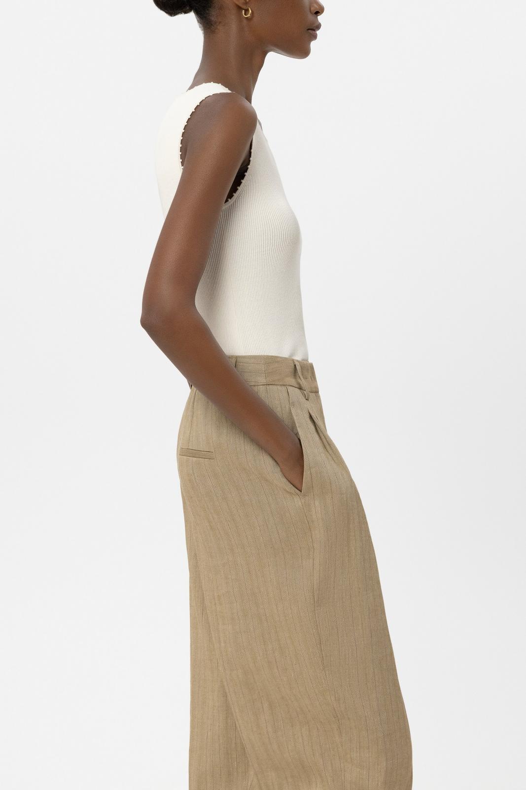 Pur getragen wirkt das Top besonders weich und zurückhaltend zu hellen Hosen oder fließenden Röcken. Unter Blazern oder leichten Strickjacken eingesetzt, entsteht ein ruhiger Layering-Look mit feiner Struktur und femininer Ausstrahlung.