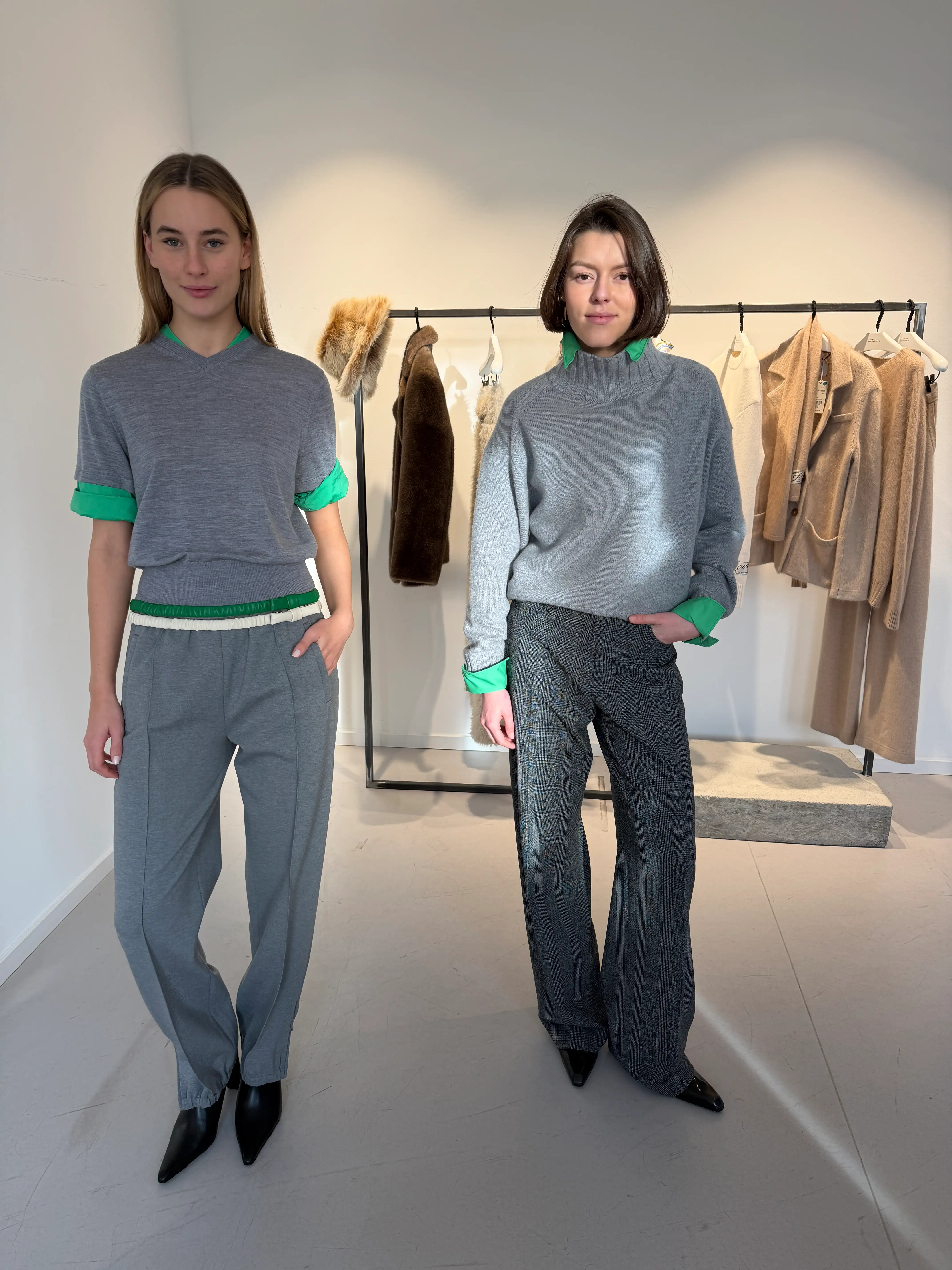 Im Zentrum für den nächsten Winter stehen für mich die Farben Grau, Grün und Dunkelblau. Auf dem zweiten Bild sieht man eine graugrüne Kombination von Dorothee Schumacher – für mich ein gutes Beispiel dafür, wie ruhig und zugleich modern diese Farbwelt wirken kann.