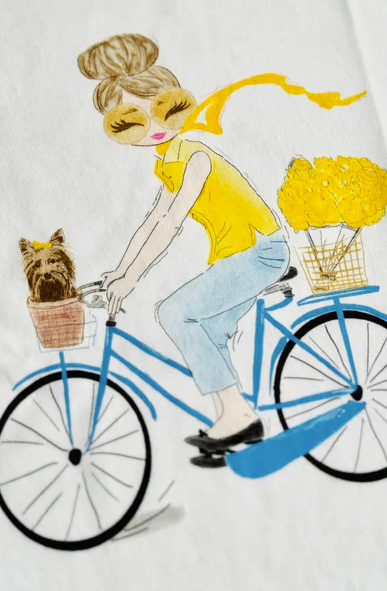 Das T-Shirt „Bike Yellow“ von Sustyle bringt sanfte Frische in den Alltag. Auf weißem Fond entfaltet die Illustration einer radelnden Frau mit gelben Blumen eine leichte, sonnige Ausstrahlung. Der lockere Schnitt und der kleine, aufgekrempelte Armsaum unterstreichen die entspannte Linienführung. Die hochwertige, weiche Baumwolle liegt angenehm auf der Haut und sorgt für ein natürliches Tragegefühl. Als limitierte Edition verbindet dieses Shirt verspielte Details mit klarer Modernität.