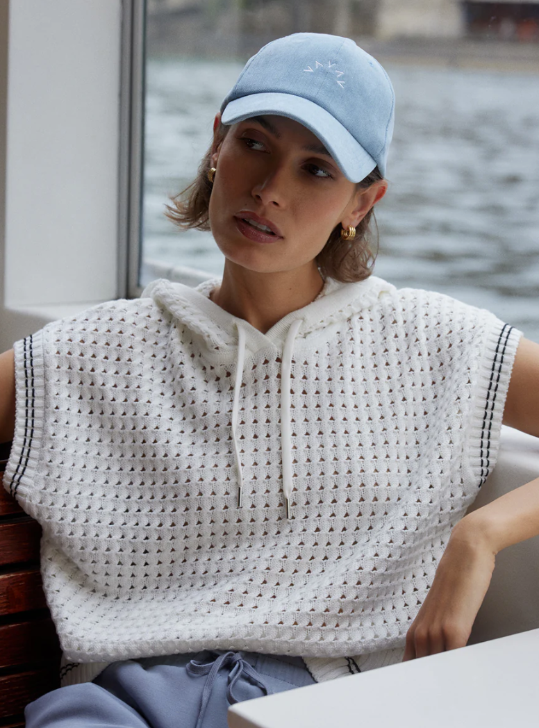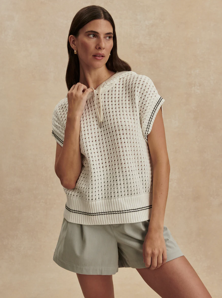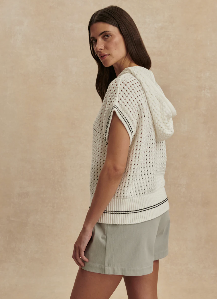 Ein leichter Strick-Hoodie mit moderner, luftiger Struktur: Der „Vittoria“ von Varley verbindet entspannten Komfort mit feiner Detailarbeit. Das ärmellose Design wirkt sommerlich und unkompliziert, während die offene Pointelle-Struktur mit Twist-Cable-Optik dem Modell eine dezente Raffinesse verleiht. In „Snow White“ entsteht ein klarer, ruhiger Look mit sportivem Anspruch.