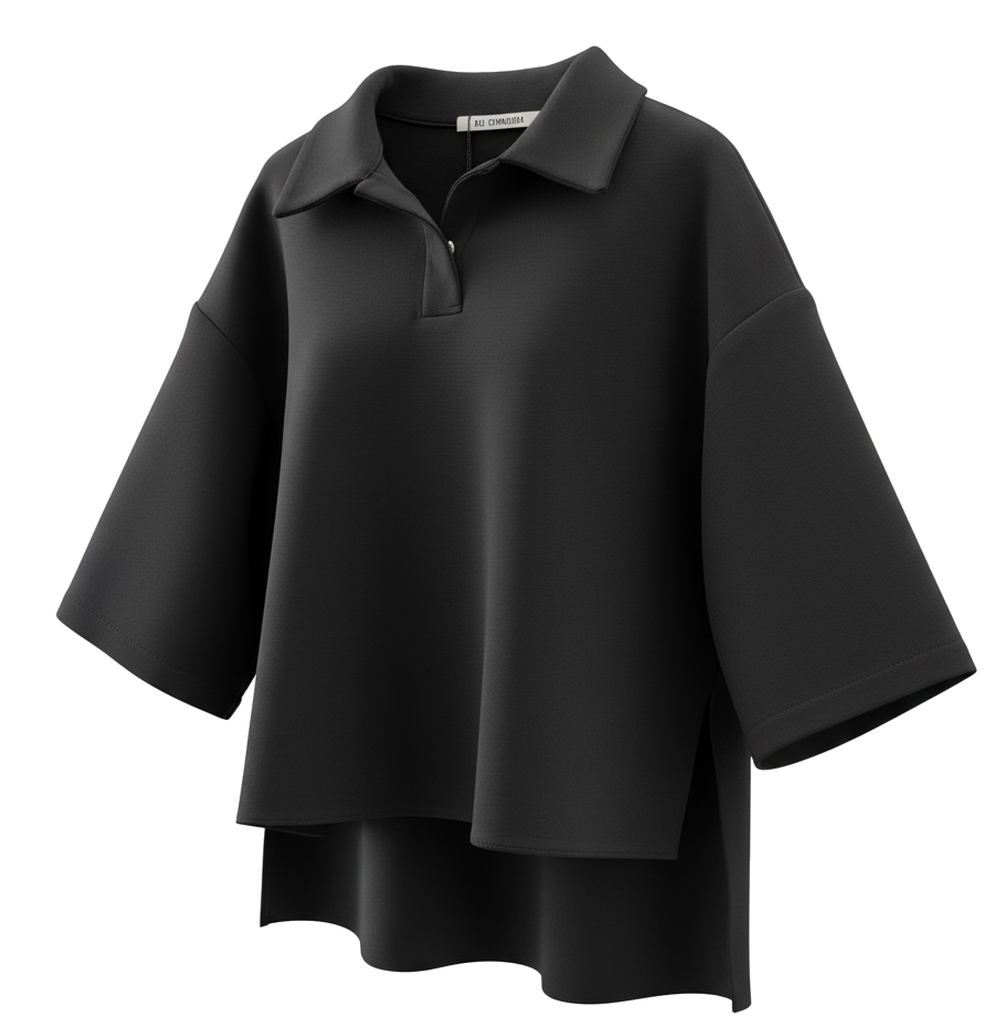 Das Sweatpolo von Uli Schneider ist ein modernes, lässiges Poloshirt aus einer etwas festeren Sweat-Qualität, die eine klare und elegante Silhouette erzeugt. Das Modell besitzt einen kleinen V-Ausschnitt, der mit einem dezenten Druckknopf geschlossen wird, sowie einen klassischen, formstabilen Kragen. Die weite A-Linie, der Dreiviertelarm und das verlängerte Rückenteil verleihen dem Sweatpolo seine entspannte, souveräne Wirkung.