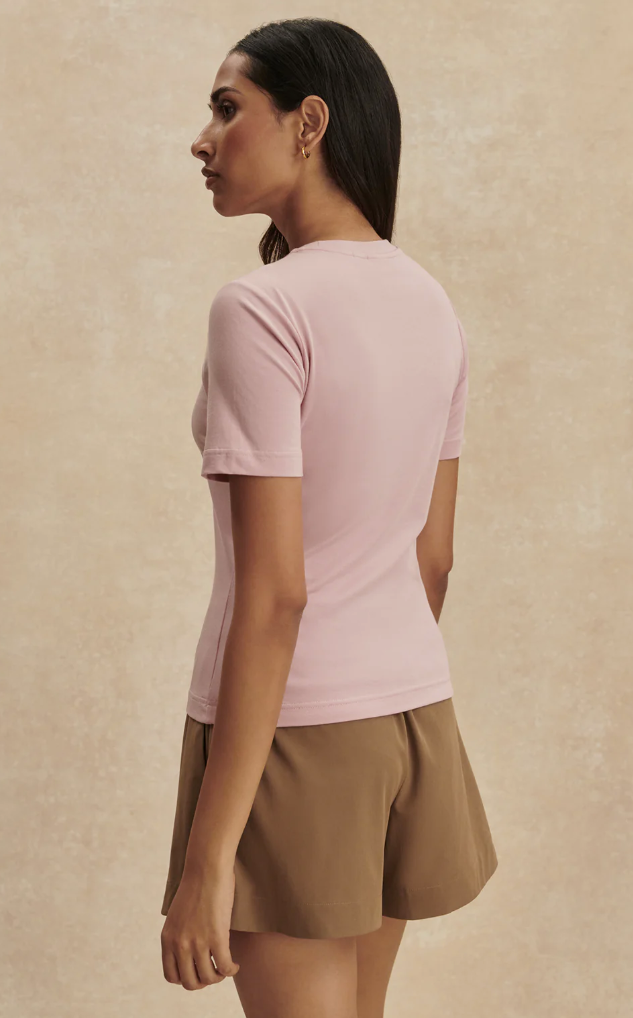 Das Regina Tee von Varley zeigt sich als klares Essential mit femininer Linienführung. Die weiche Modal-Jersey-Qualität schmiegt sich angenehm an den Körper, während die taillierte Silhouette und die präzise gesetzten Ärmel eine ruhige, gepflegte Ausstrahlung schaffen. In Rose wirkt das Modell weich und modern – ein vielseitiges Basic für jeden Tag.