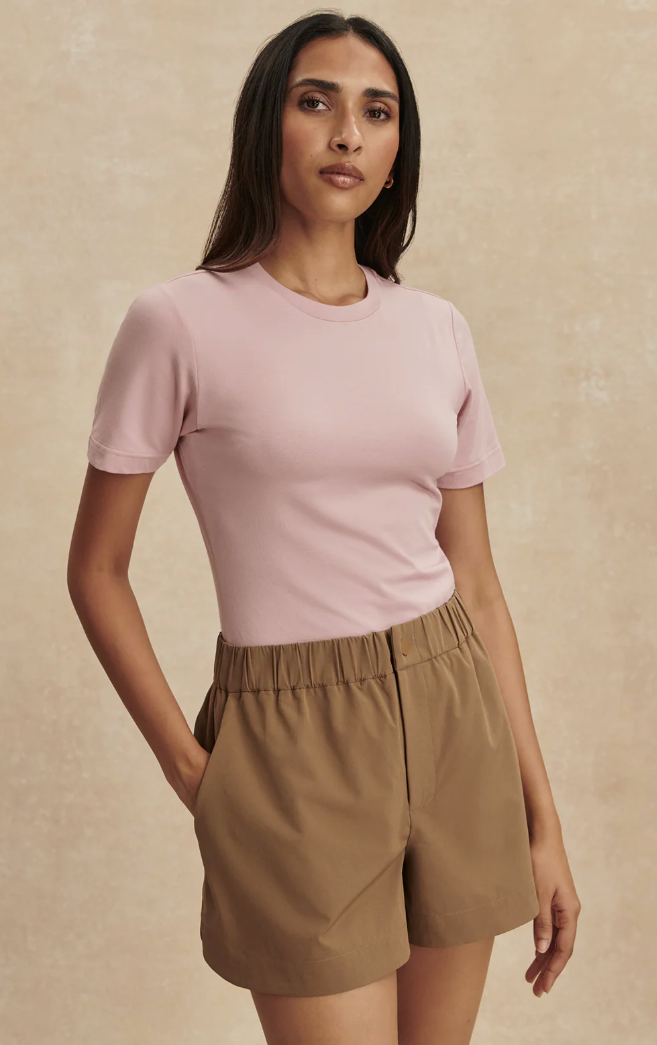 Das Regina Tee von Varley in Rose lässt sich ideal mit soften Naturtönen wie Sand, Creme oder Taupe kombinieren. Besonders stimmig wirkt es zu leichten Shorts oder fließenden Hosen. Ergänzt mit cleanen Sneakern oder minimalistischen Sandalen entsteht ein entspannter, moderner Alltagslook.