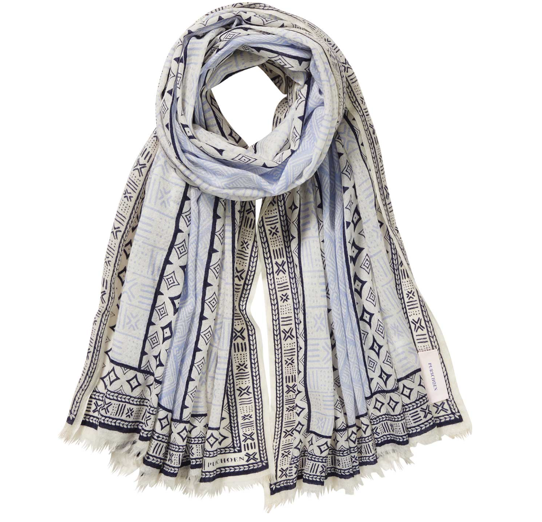 Ein feines, gewebtes Muster in sanftem Azzur verleiht diesem Cashmere-Schal eine ruhige, kultivierte Ausstrahlung. Die filigrane Ornamentik wirkt modern und zugleich zeitlos, während die großzügigen Maße dem Tuch einen fließenden, eleganten Fall schenken. Reiner Cashmere sorgt für eine außergewöhnlich weiche Haptik und angenehme Wärme. Der Schal von Pur Schoen verbindet Leichtigkeit mit luxuriösem Komfort und begleitet stilvoll durch kühlere Tage.