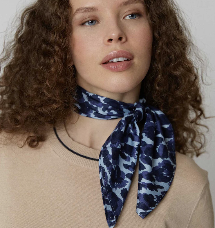 In der Farbkombination Hellblau–Blau bzw. Hellblau–Dunkelblau wirkt der Print modern, frisch und gleichzeitig zeitlos. Ob klassisch um den Hals, lässig ins Haar gebunden oder als Akzent an Tasche oder Gürtel – dieser Mini Cube verleiht jedem Look eine besondere Note.