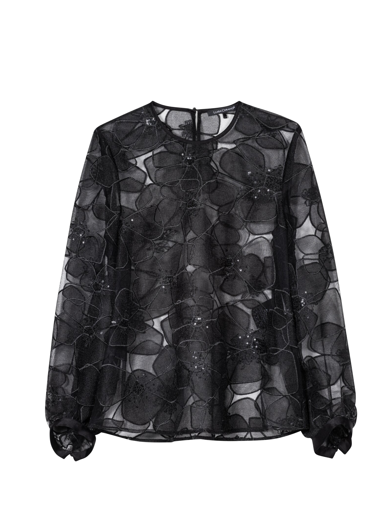 Zarte, transparente Tüllbluse von Luisa Cerano mit aufwendiger Blütenstruktur und funkelnden, aufgestickten Pailletten. Die leicht ausgestellte Silhouette verleiht dem Look feminine Leichtigkeit. Voluminöse Ärmel enden in satinbezogenen Bündchen mit stoffüberzogenem Knopf. Im Nacken setzt ein dezent glänzender Schmuckknopf einen edlen Akzent. Ein außergewöhnliches Statement-Piece für elegante Abendlooks oder moderne, festliche Outfits.