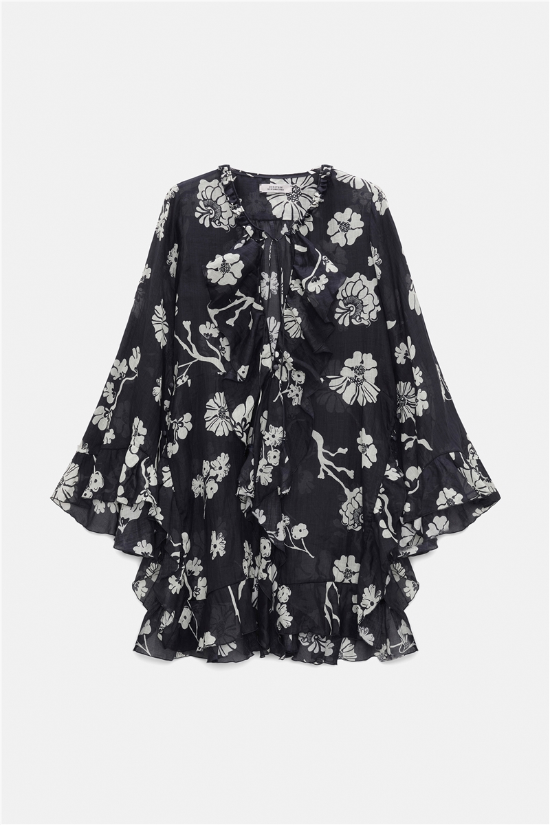 - Schnitt/Passform: Locker sitzende Tunika mit kaskadenförmigen Rüschen, Volant-Verarbeitung am Brustausschnitt, Raw-Edge-Rüsche am Halsausschnitt mit langen Tassels, Seitenschlitze mit bezogenen Knöpfen
