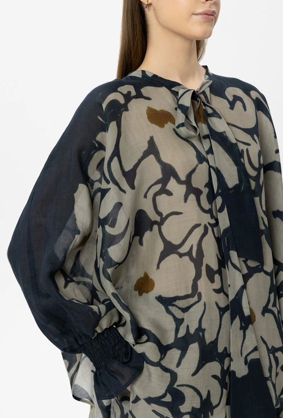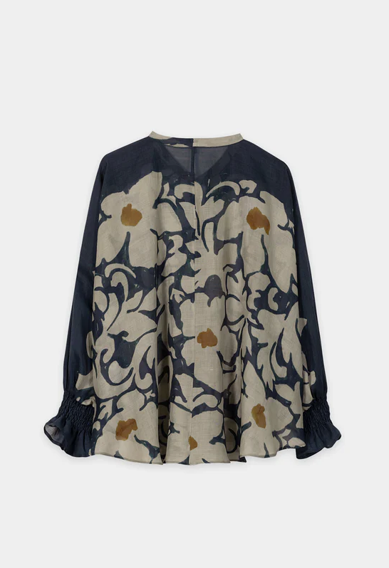Diese semitransparente Bluse aus einer feinen Lyocell-Ramie-Mischung besticht durch ihr exklusives, ornamentales Blumendessin und eine fließende, luftige Silhouette. Die Cape-Form verleiht dem Design eine besondere Leichtigkeit und Bewegung, während der offene Ausschnitt mit Schluppe und die gesmokten Ärmelabschlüsse elegante Akzente setzen. Die Kombination aus Transparenz und Struktur unterstreicht die moderne, ausdrucksstarke Handschrift von Luisa Cerano.