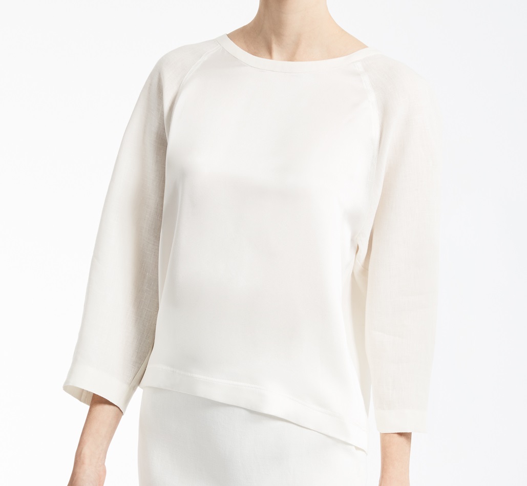 Kasack aus gewaschener reiner Seide mit Details aus reinem Leinen an den Raglanärmeln und am Rücken. Zierkordel und Ösen in der Mitte.