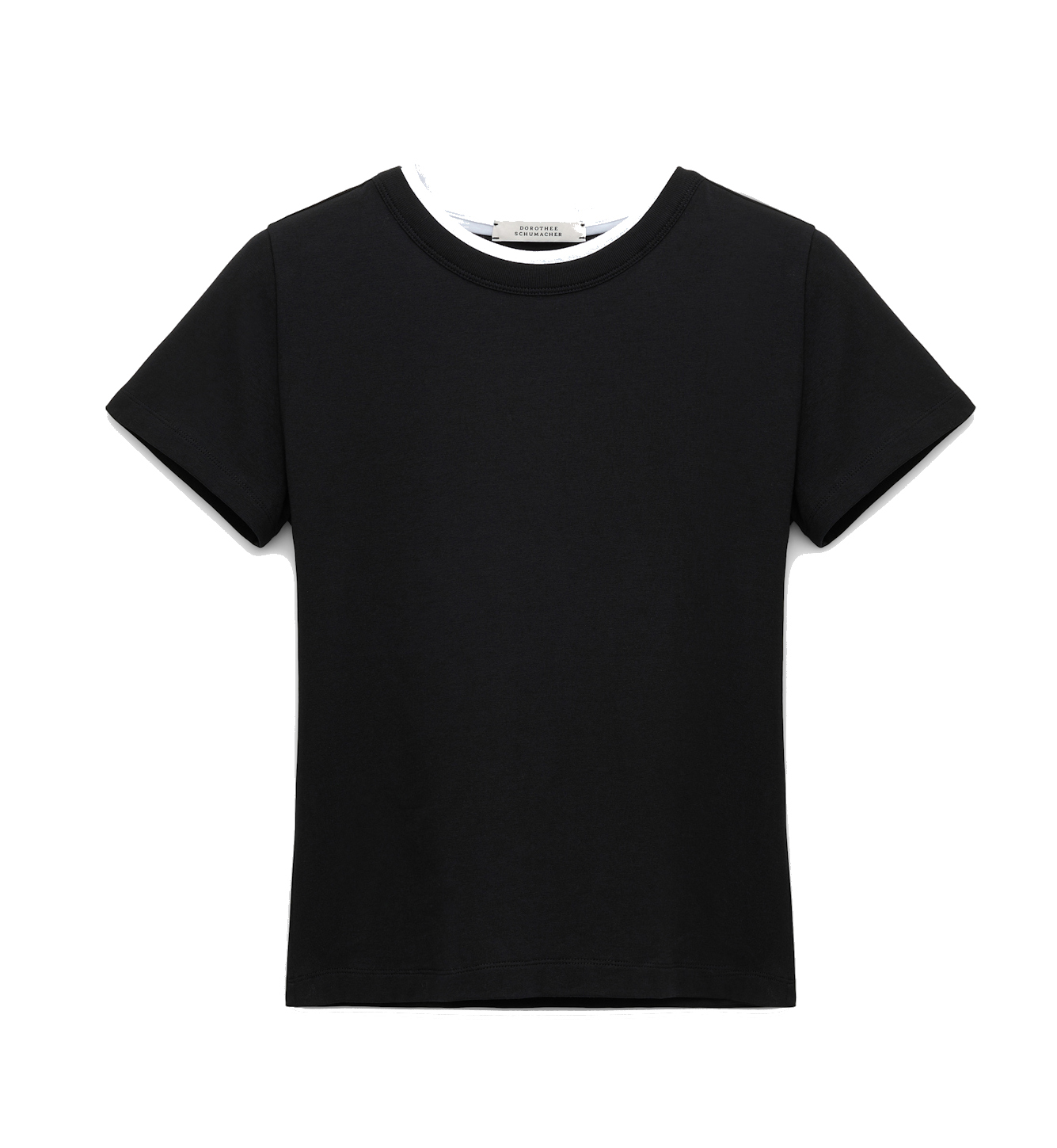 Das Shirt von DOROTHEE SCHUMACHER überzeugt durch einen gedoppelten Kragen mit feiner Rippeneinfassung und kontrastierendem Unterkragen.