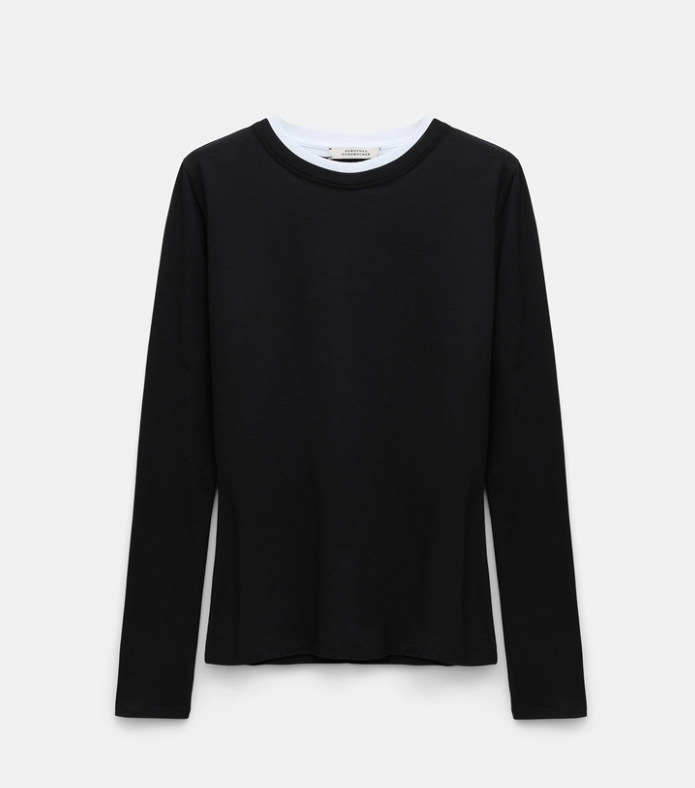 Das Shirt von DOROTHEE SCHUMACHER überzeugt durch einen gedoppelten Kragen mit feiner Rippeneinfassung und kontrastierendem Unterkragen.
