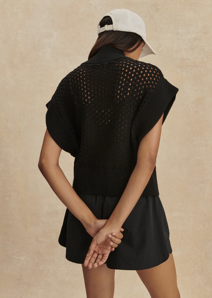 Das Gaines Knit von Varley lässt sich ideal mit schlichten Shorts oder einer cleanen Stoffhose kombinieren. Besonders stimmig wirkt der Look mit monochromen Styles in Schwarz oder Off-White. Ein dezentes Top oder Bralette darunter unterstreicht die luftige Struktur, während Sneaker oder leichte Slides den entspannten, modernen Charakter abrunden.