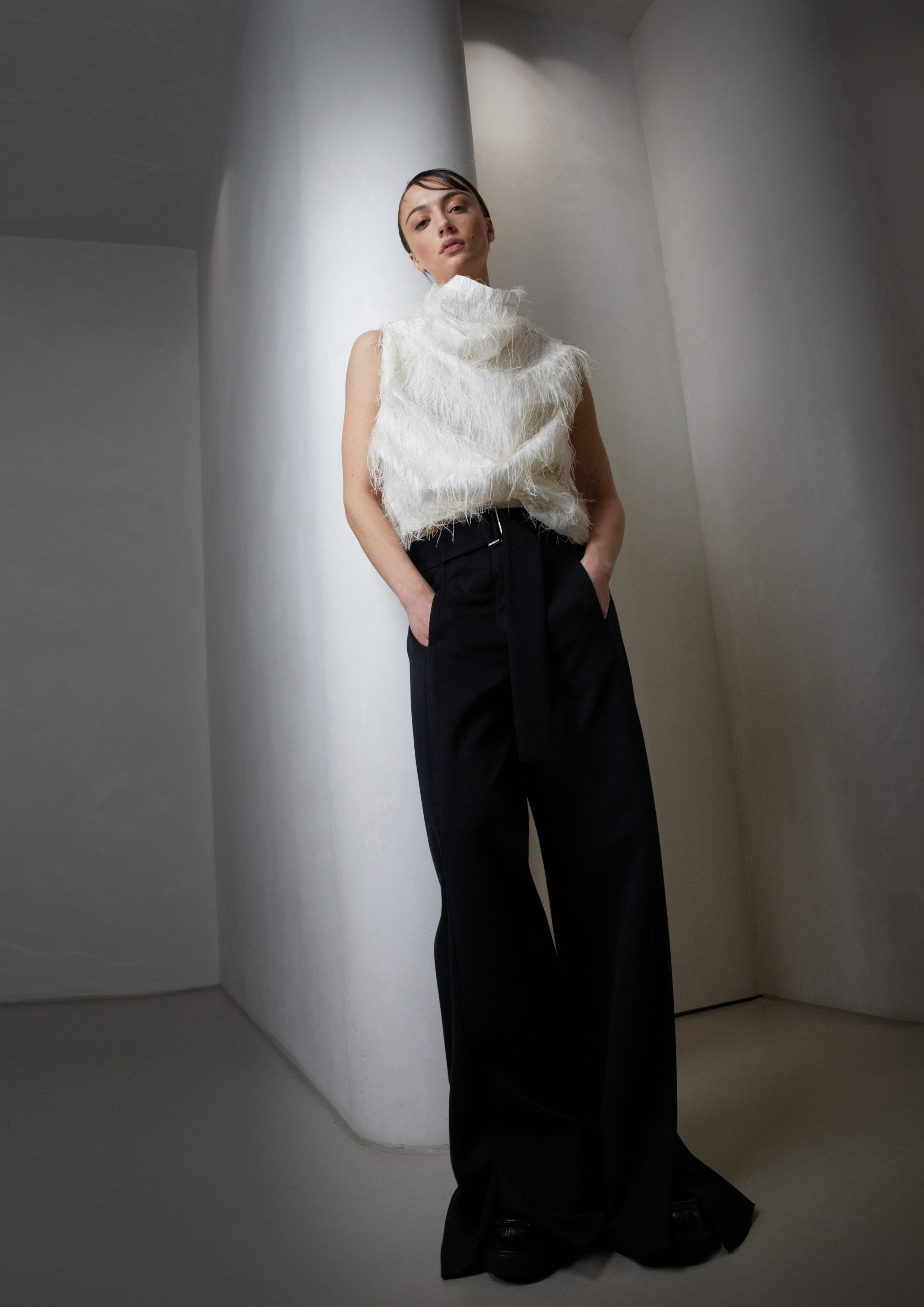 Das Tec Marabou Drape-Top von ULI SCHNEIDER ist ein außergewöhnliches Statement-Piece, das durch seine raffinierte Materialstruktur und den fließenden Schnitt besticht. Gefertigt aus 100% Polyester in der Farbe Off-White, wirkt es luxuriös, leicht und modern zugleich. Der markante Wasserfallkragen und die kunstvollen Raffungen im Vorderbereich verleihen dem Top eine elegante Silhouette, während die aufgesetzten Fransen für einen besonderen, fast federartigen Look sorgen. Der ärmellose Schnitt mit weitem Armausschnitt bietet Komfort und Bewegungsfreiheit, wodurch das Top vielseitig kombinierbar ist – von eleganten Abendoutfits bis hin zu lässigen Casual-Looks. Die Rückseite ist bewusst schlicht gehalten, um den Fokus auf die vordere Drapierung zu legen.