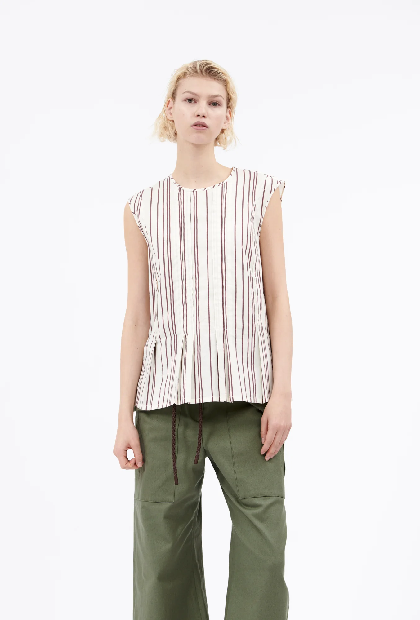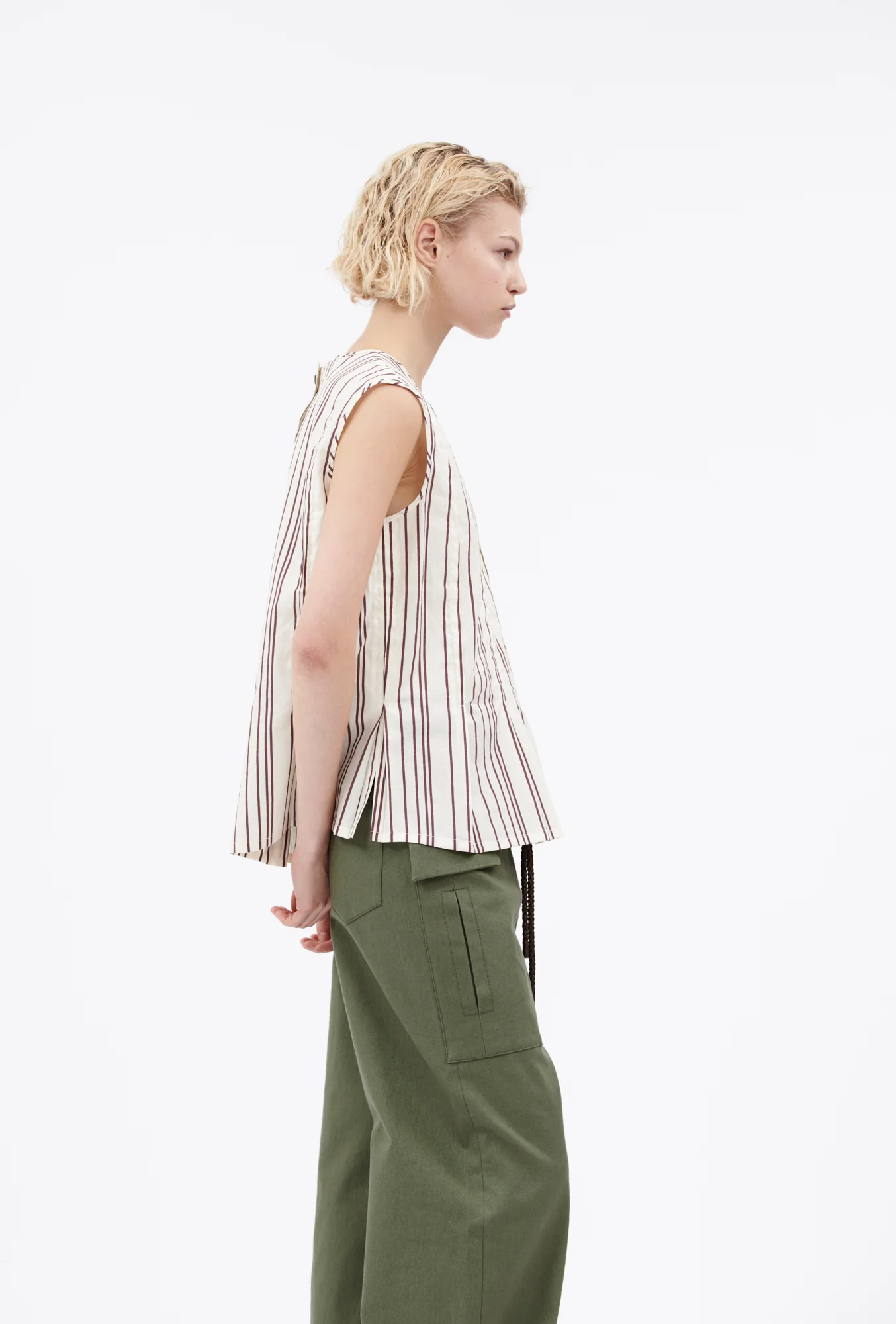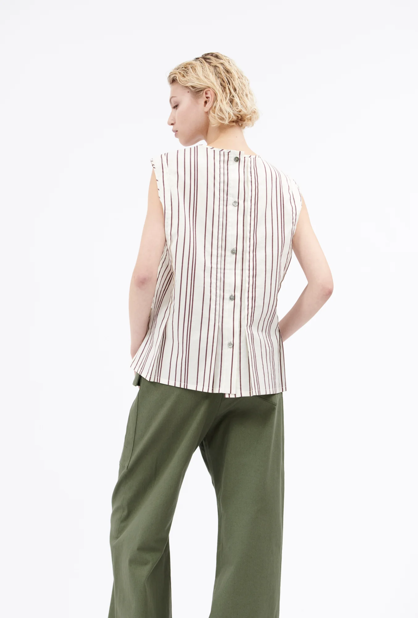 Leichte Struktur und klare Linien prägen das FANCY STRIPE TOP von Odeeh. Das ärmellose Design wirkt modern und entspannt, während feine Längsabnäher in der Taille eine subtile Form geben. Der gestreifte Stoff in Weiß und Burgundy verleiht dem Top eine grafische Ruhe, die sich vielseitig kombinieren lässt. Die durchgehende Knopfleiste auf der Rückseite setzt ein dezentes Detail und unterstreicht die reduzierte, hochwertige Ästhetik.