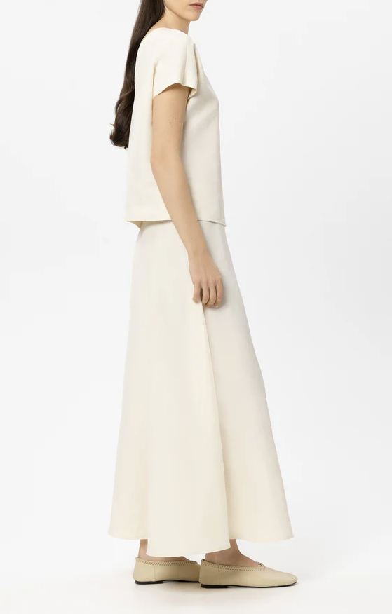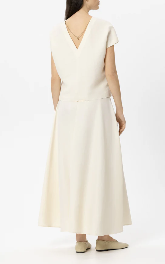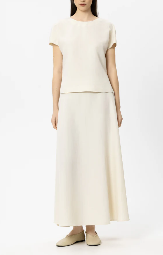 In Kombination mit weiten Hosen oder fließenden Röcken in hellen Naturtönen entsteht ein harmonischer, moderner Look. Auch unter einem leichten Blazer getragen entfaltet das Top seine ruhige Wirkung. Schlichte Schuhe und feine Accessoires unterstreichen die klare Linie.