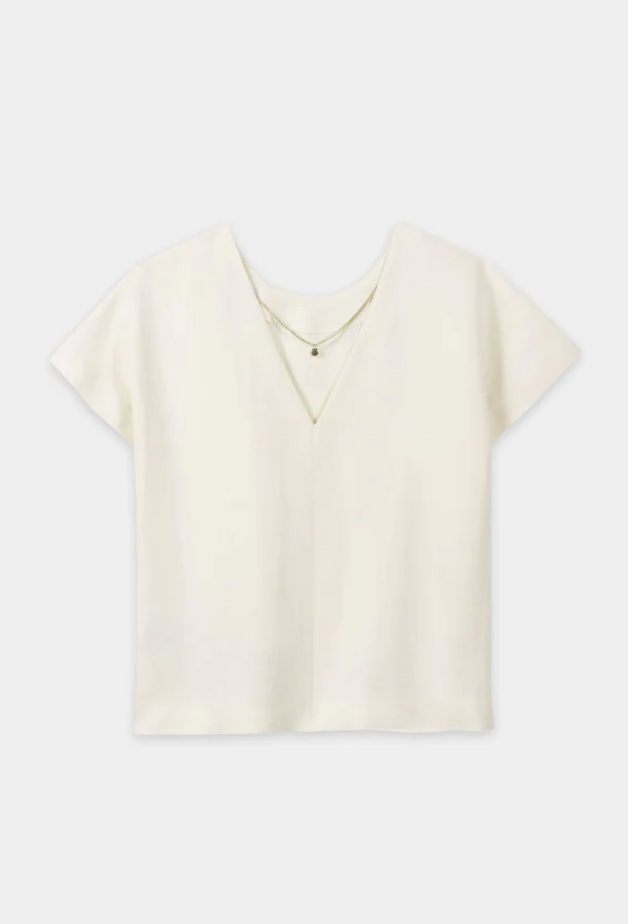 Eine reduzierte Silhouette mit feinen, modernen Details. Das kastig geschnittene Blusentop aus einem hochwertigen Leinen-Mix von Luisa Cerano wirkt klar und ruhig, während die offenen Saumkanten eine dezente Lässigkeit einbringen. Der rückseitige V-Ausschnitt mit abnehmbarem Ketten-Detail setzt einen subtilen, eleganten Akzent und verleiht dem Design eine besondere Tiefe.