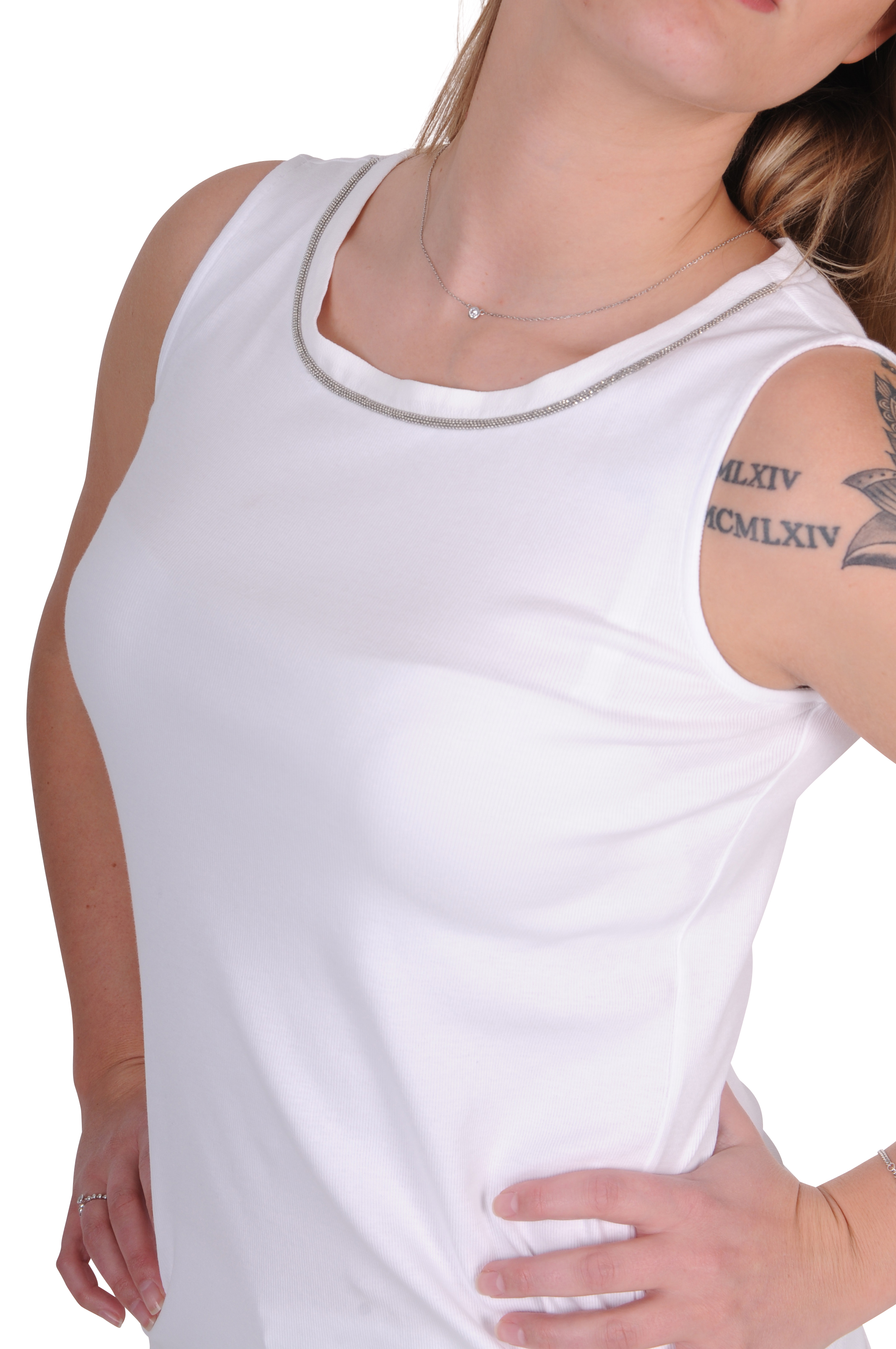 Durch die kleinen silbernen Details am Ausschnitt wird dieses Top zum elegantem Basic.