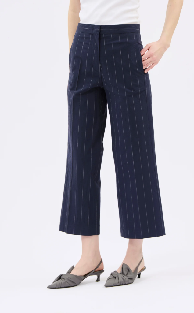 Maskuline Klarheit trifft auf moderne Leichtigkeit: Die „Papertouch Stripe“ Hose von ODEEH interpretiert klassische Anzugdetails neu. Der feine weiße Nadelstreifen auf tiefem Marine wirkt präzise und ruhig, während die leicht ausgestellte Silhouette eine subtile Dynamik in den Look bringt.