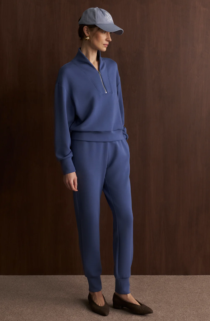Die The Slim Cuff Pant von Varley in Bijou Blue lässt sich ideal mit passenden DoubleSoft®-Sweats im gleichen Farbton kombinieren. So entsteht ein harmonischer, tonaler Look mit sportiv-eleganter Ausstrahlung. Ergänzt mit cleanen Sneakern oder Loafern wirkt das Outfit modern und entspannt zugleich.