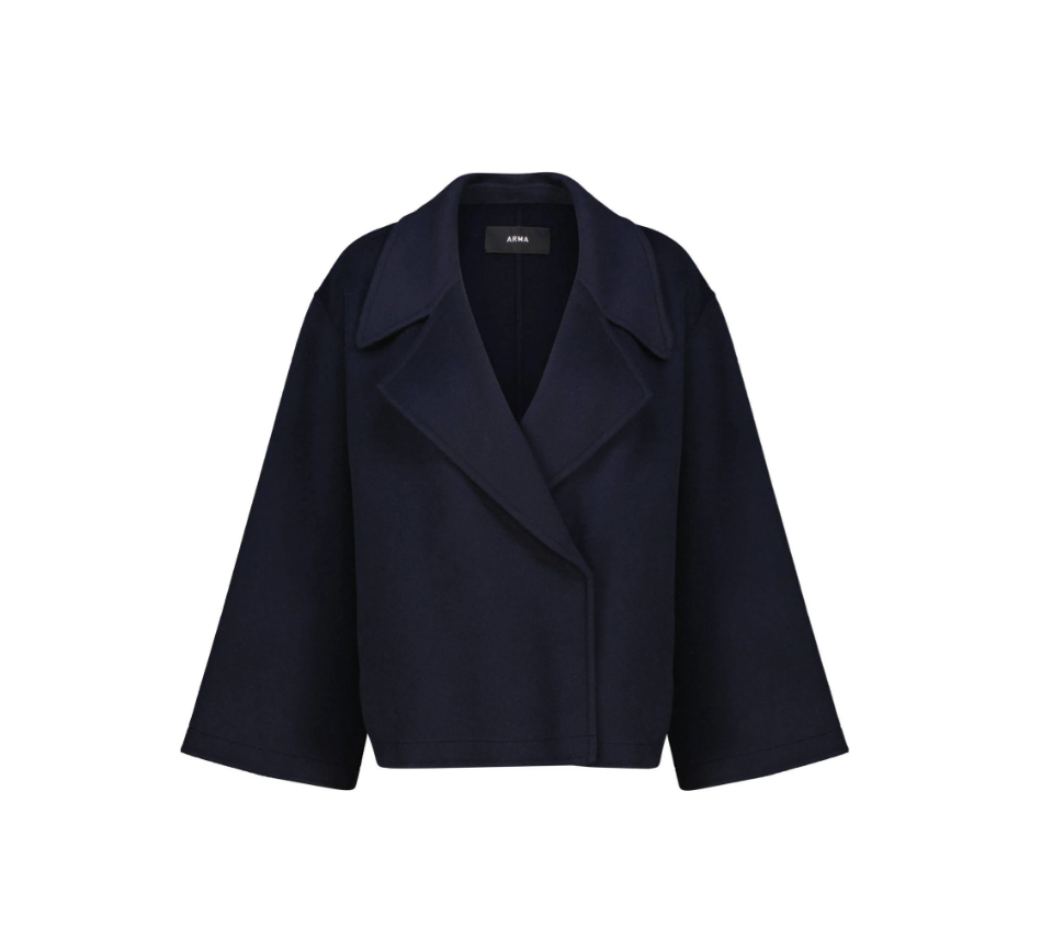 Die Jacke Malika von ARMA ist ein stilvoller Begleiter für die Übergangszeit. In der eleganten Farbe Night überzeugt sie durch ihre edle Schlichtheit und hochwertige Verarbeitung aus 100% Wolle. Die leicht ausgestellte Form verleiht der Jacke einen femininen Schwung, während die seitlichen Eingrifftaschen praktischen Komfort bieten. Der klassische Kragen und der einzelne Druckknopfverschluss unterstreichen den zeitlosen Look. Dank der weiteren Ärmel lässt sich die Jacke bequem über Pullover oder leichtere Strickteile tragen – perfekt für stilvolle Outfits an kühleren Tagen.