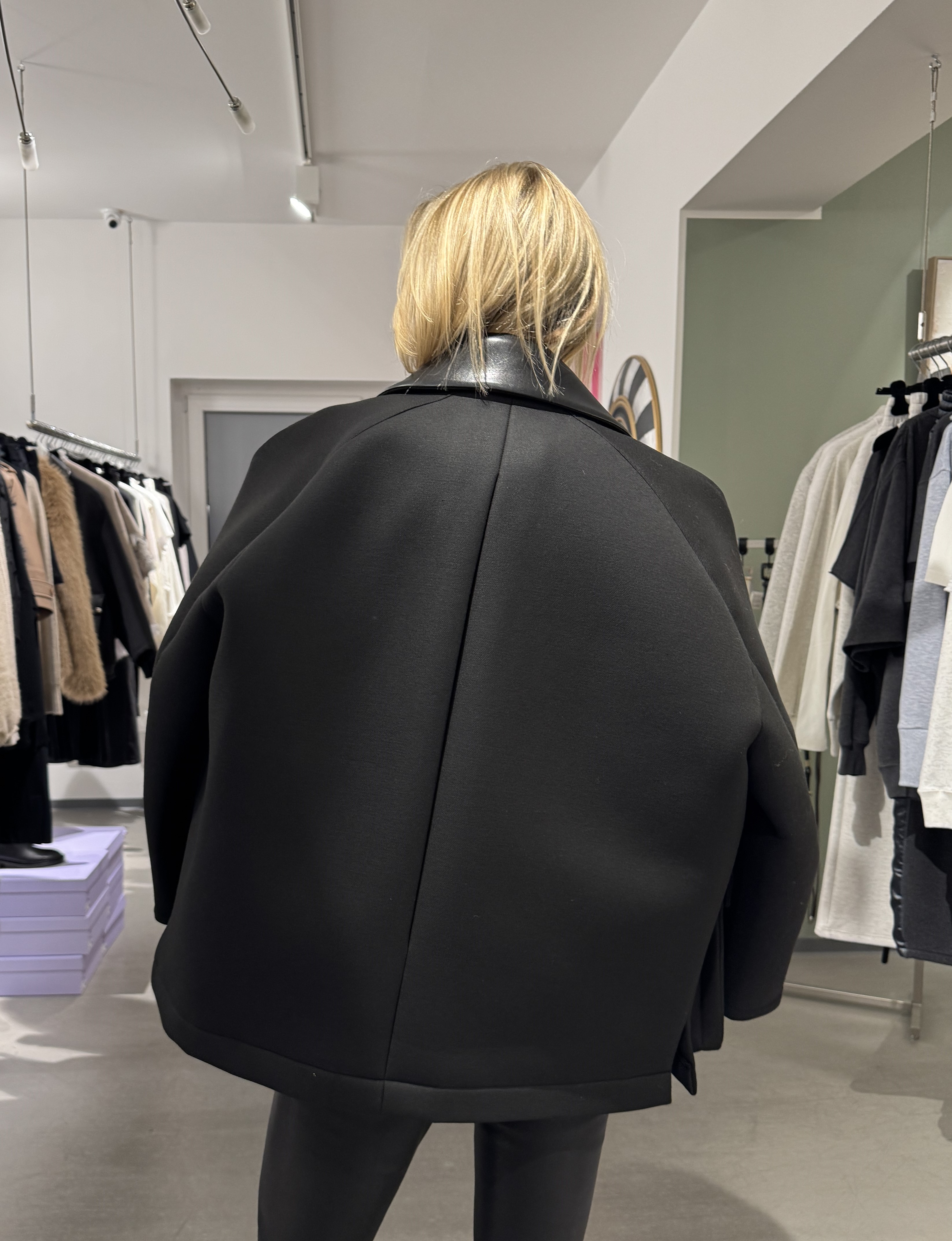 Die Wool Neopren Barn Jacket von ULI SCHNEIDER überzeugt durch ihr modernes, minimalistisches Design und ihre markante Materialstruktur. Das feste, leicht steife Material erinnert von innen an Neopren und verleiht der Jacke ihren besonderen Charakter. Aufgesetzte Taschen, metallische Nieten-Details unter den Armen sowie der Zwei-Wege-Reißverschluss unterstreichen die urbane Coolness. Der oversized Schnitt mit weitgeschnittenen Ärmeln und ausgestellt fallender Silhouette sorgt für eine lässige, gleichzeitig elegante Optik. Der Kragen aus veganem Leder setzt einen stilvollen Akzent. Eine Rückennaht verleiht der Jacke zusätzlich Form. Ein Statement-Piece in tiefem Schwarz für selbstbewusste Looks.
