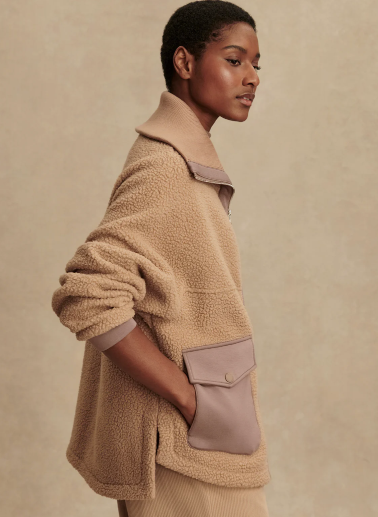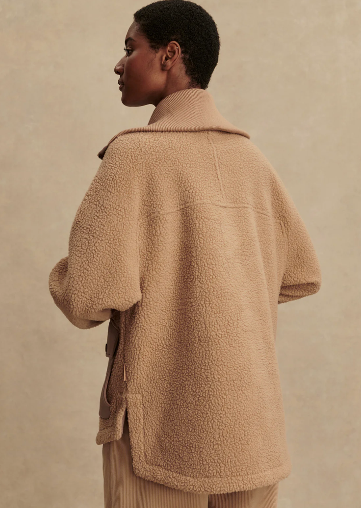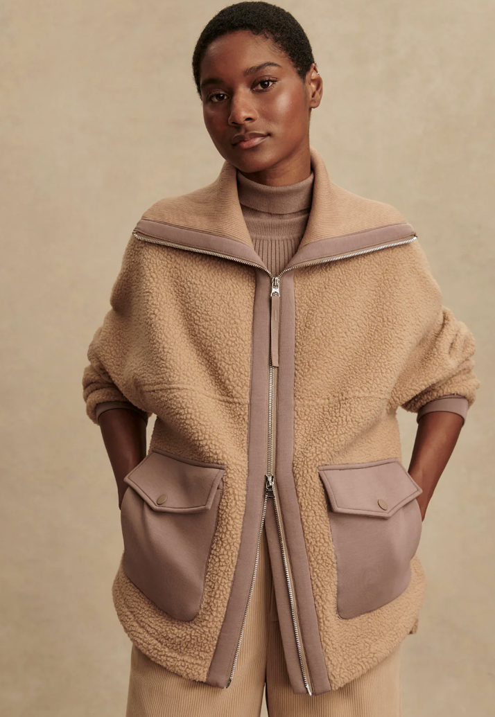 Diese kuschelige Plüschjacke von VARLEY verbindet Wohlfühlkomfort mit lässigem Design. Der Zwei-Wege-Reißverschluss und das verlängerte Rückenteil sorgen für praktische Funktionalität, während der Rollkragen mit breitem Rippstrick nicht nur warmhält, sondern auch den Schal überflüssig macht. Die Druckknopftaschen mit kontrastierendem Besatz setzen stylische Akzente. Dank lockerer Passform, überschnittener Schultern und kleinen seitlichen Schlitzen ist die Jacke perfekt für entspannte Looks an kühleren Tagen.