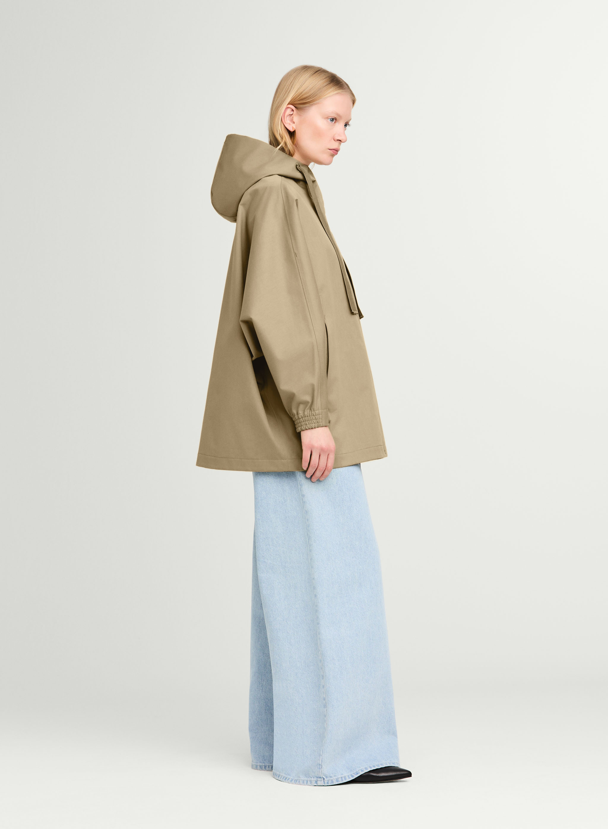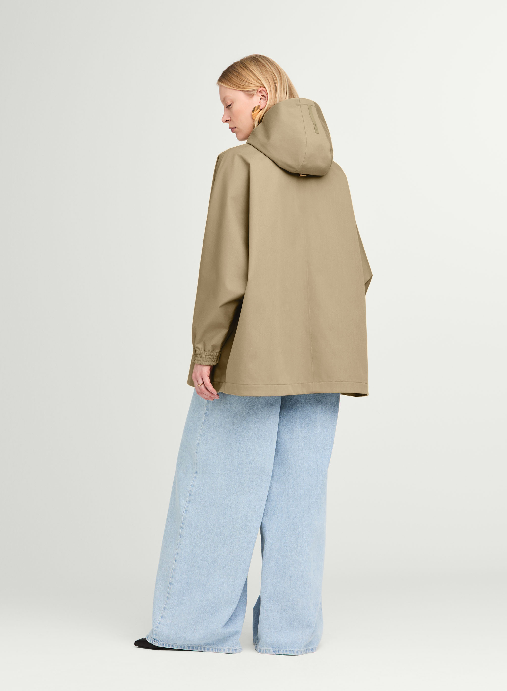 Die capeartige Form wirkt am klarsten über schmalen Linien darunter: eine gerade Stoffhose, ein schmales Kleid oder Denim in Clean-Wash. Dazu passen feiner Strick oder ein leichtes Top, um die Volumenbalance zu halten. In Light Sand entsteht ein ruhiges, helles Gesamtbild, das mit Ton-in-Ton-Nuancen ebenso funktioniert wie mit kontrastierendem Schwarz oder Navy.