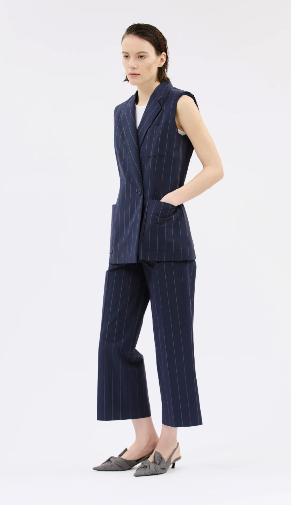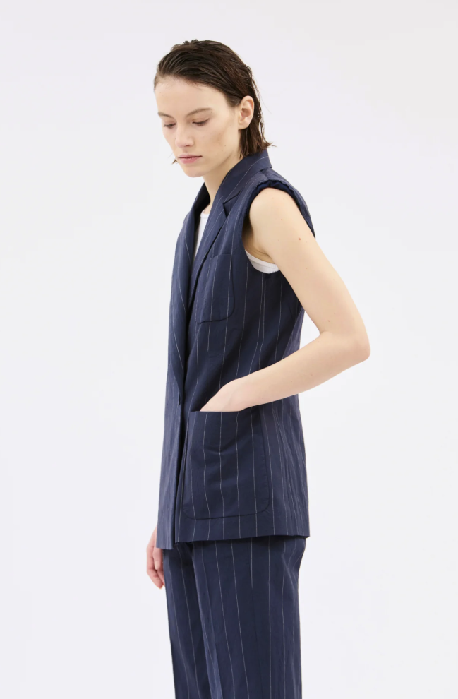 Am stimmigsten wirkt die Weste im Set mit der passenden Papertouch Stripe Hose. Darunter ein reduziertes Top oder ein feines Shirt in Weiß, um den Kontrast zum Nadelstreifen klar hervorzuheben. Schlichte Loafer oder filigrane Heels greifen die maskuline Linie auf und führen sie feminin weiter.