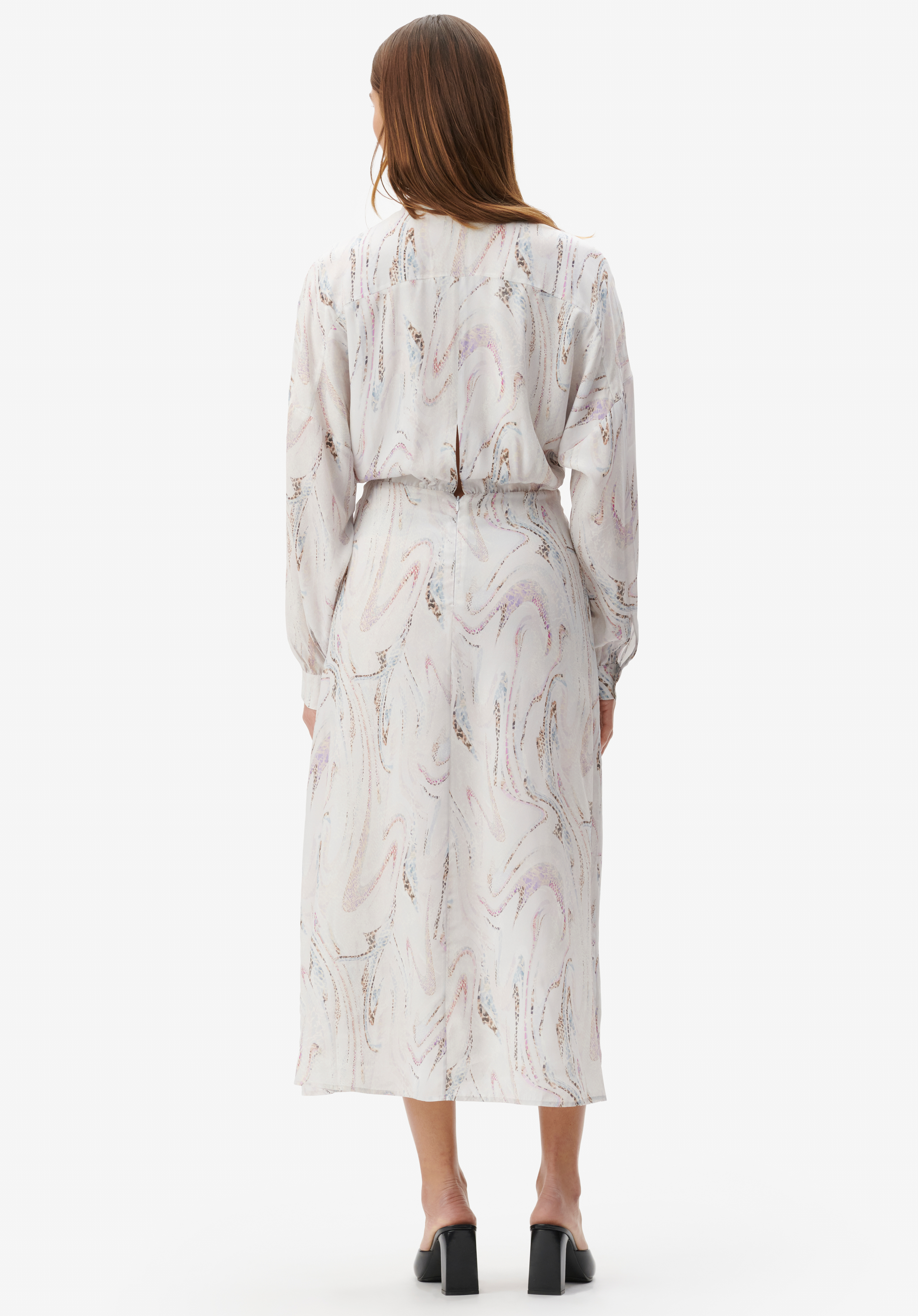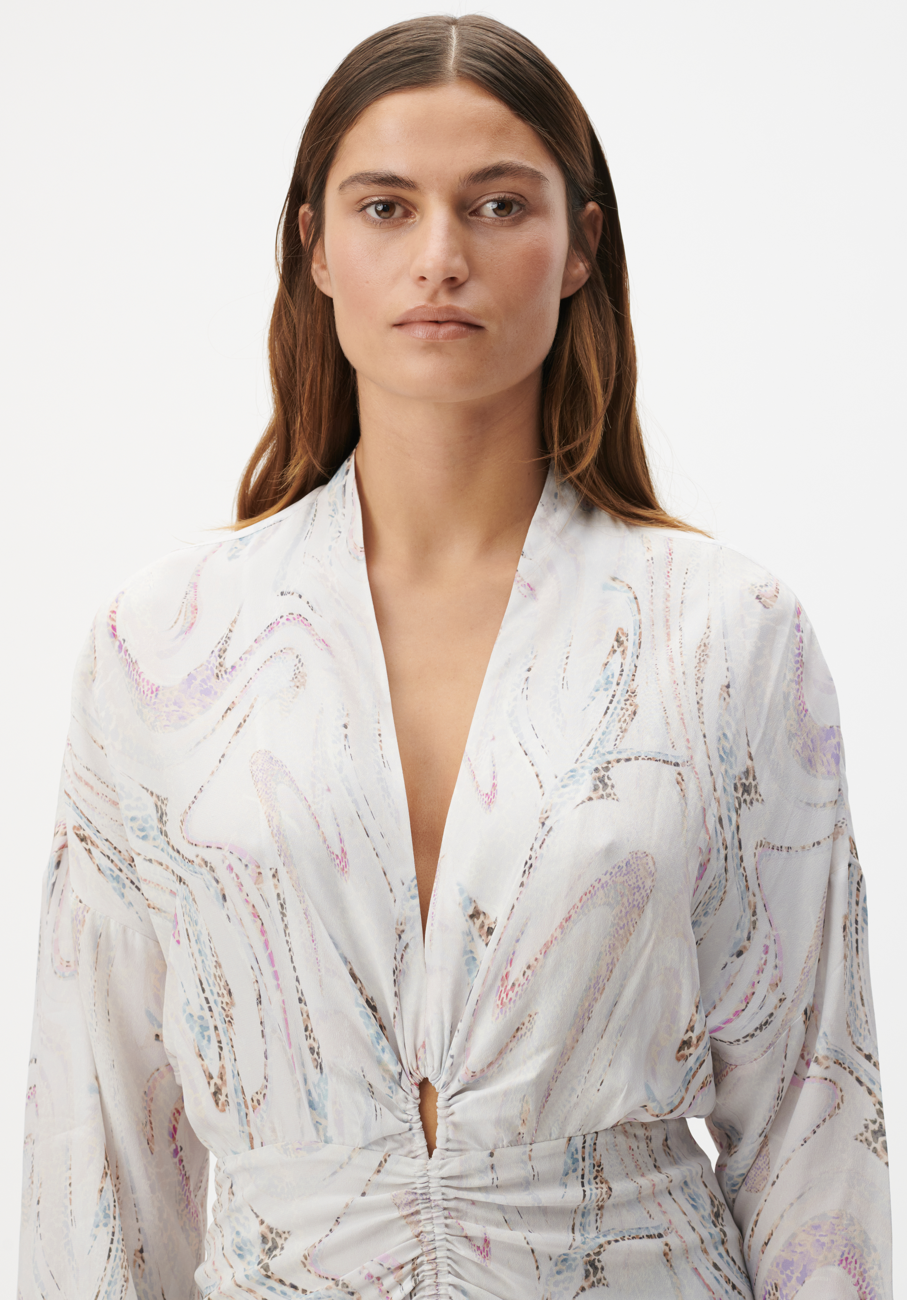 Die moderne Version des Hemdkleides von LALA BERLIN aus einem fließendem Crépe de Chine Stoff mit achatblauem Druck.