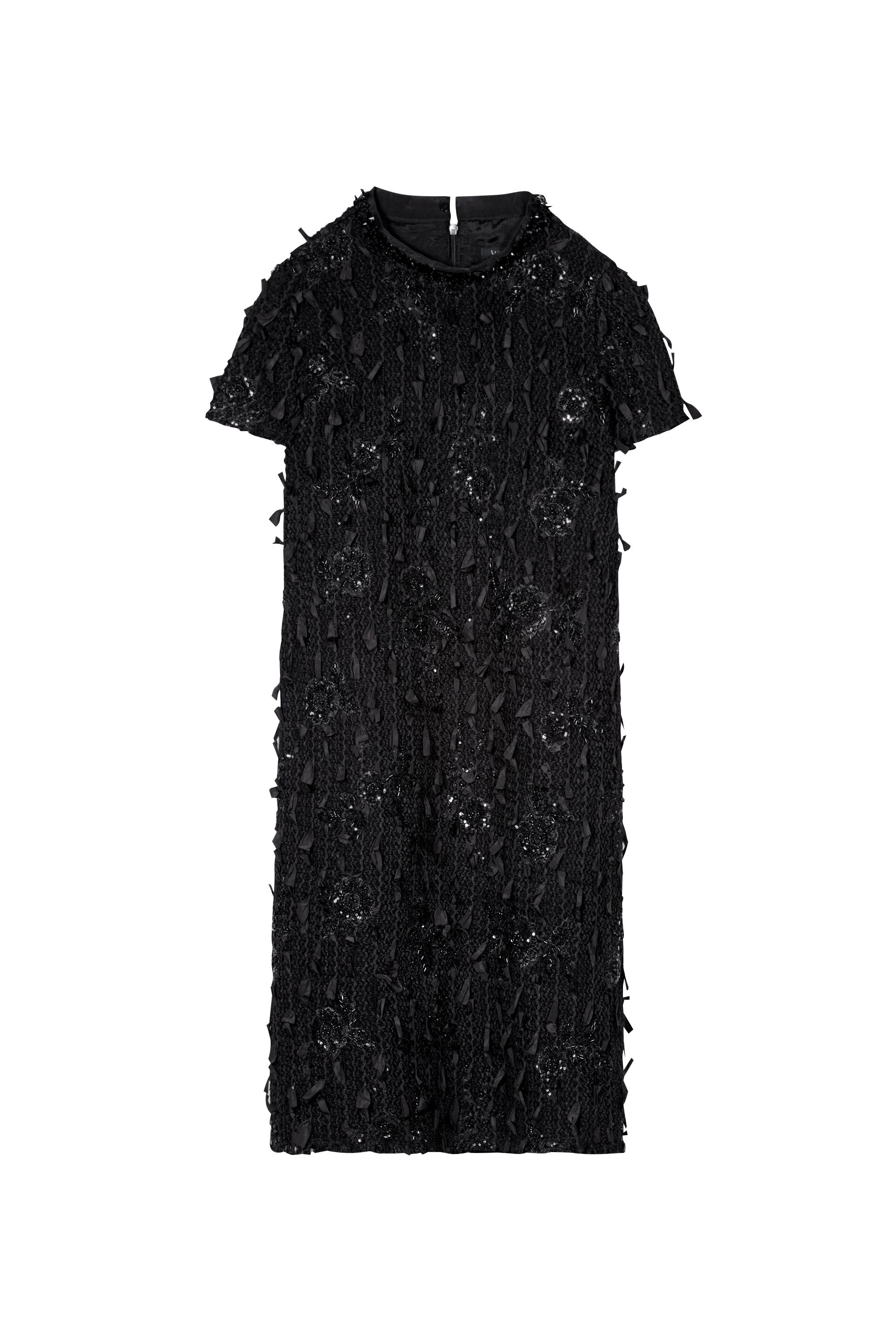 Exklusives, gefüttertes Schiffskleid aus hochwertigem Tweed-Material von Luisa Cerano, kunstvoll besetzt mit Paillettenperlen und dekorativen Bändern. Die offene Kantenverarbeitung an Kappärmeln und Saum verleiht dem Kleid eine moderne, leicht edgy Note, während der kleine, mit Pailletten verzierte Kragen für einen funkelnden Akzent sorgt. Der Rundhalsausschnitt wird im Nacken mit einem Knopf geschlossen. Ein außergewöhnliches Statement-Piece – perfekt für besondere Events und festliche Anlässe.