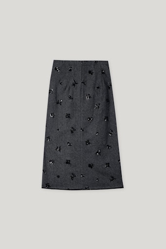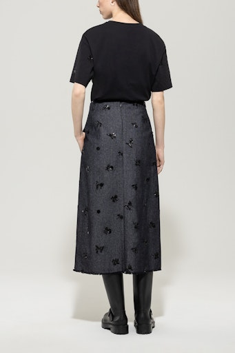 Ein Rock von LUISA CERANO mit Wow-Faktor: Der Look vereint strukturierte Denim-Optik mit eleganter Blumenstickerei aus schwarzen Pailletten. Die dezente Wickeloptik mit Faltendetails bringt Bewegung ins Design, während der offene Saum und der Gehschlitz einen modernen, lässigen Akzent setzen. Die Kombination aus Funktionalität und femininer Raffinesse macht diesen Rock zum idealen Begleiter – ob zum passenden Hemd oder ganz casual.