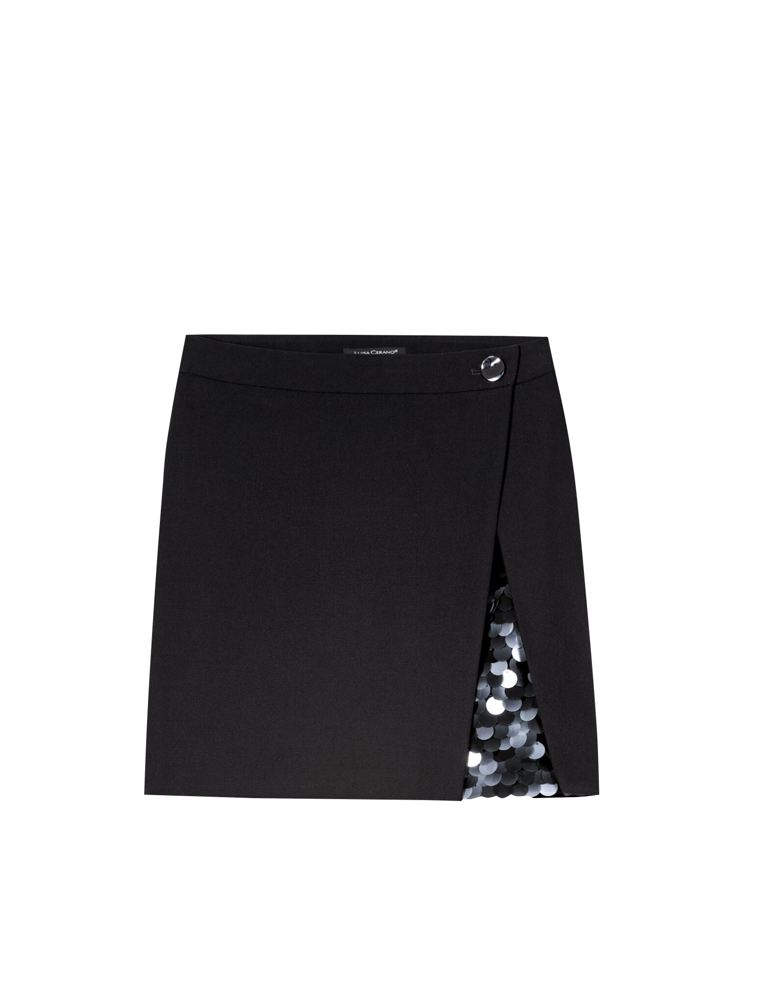 Moderner Minirock von Luisa Cerano aus bielastischer Technowolle in stilvoller Wickeloptik. Die Besonderheit zeigt sich beim Bewegen: Der vordere Innenstoff ist aufwendig mit großen, glänzenden Pailletten besetzt und blitzt raffiniert durch den seitlichen Überlappungseffekt hervor – ein echter Hingucker für besondere Anlässe. Der Rock wird oben am Bund mit einem Knopf sowie einem zusätzlichen Innenknopf sicher geschlossen. Ein hochwertiges, elastisches Material sorgt für eine perfekte Passform und hohen Tragekomfort.