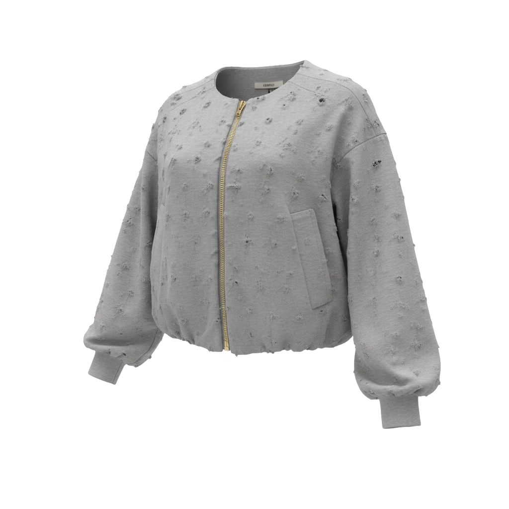 Die besondere Oberfläche mit fein strukturierten, bewusst unregelmäßigen Ausarbeitungen – eine Art dezente Destroy-Optik – sorgt für Tiefe und Charakter, ohne laut zu wirken. Der goldene Zwei-Wege-Reißverschluss setzt einen eleganten Akzent und bildet einen spannenden Kontrast zum soften Grauton.