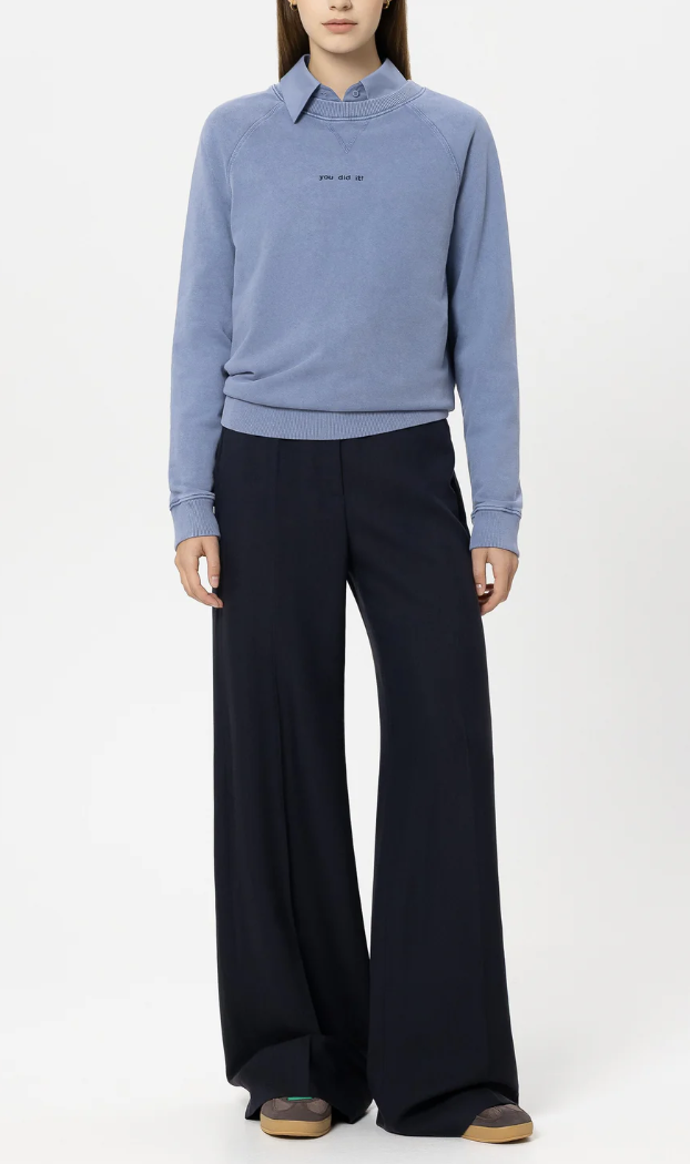 Die sportive Silhouette wird durch Raglanärmel, markante Flatlock-Nähte und breite Ribbündchen an Saum und Ärmeln unterstrichen. Ein idealer Everyday-Style, der Komfort, Design und Eleganz verbindet. Die Farbe Casual Blue lässt sich vielseitig kombinieren – ob zur Jeans, weiten Stoffhose oder Rock.