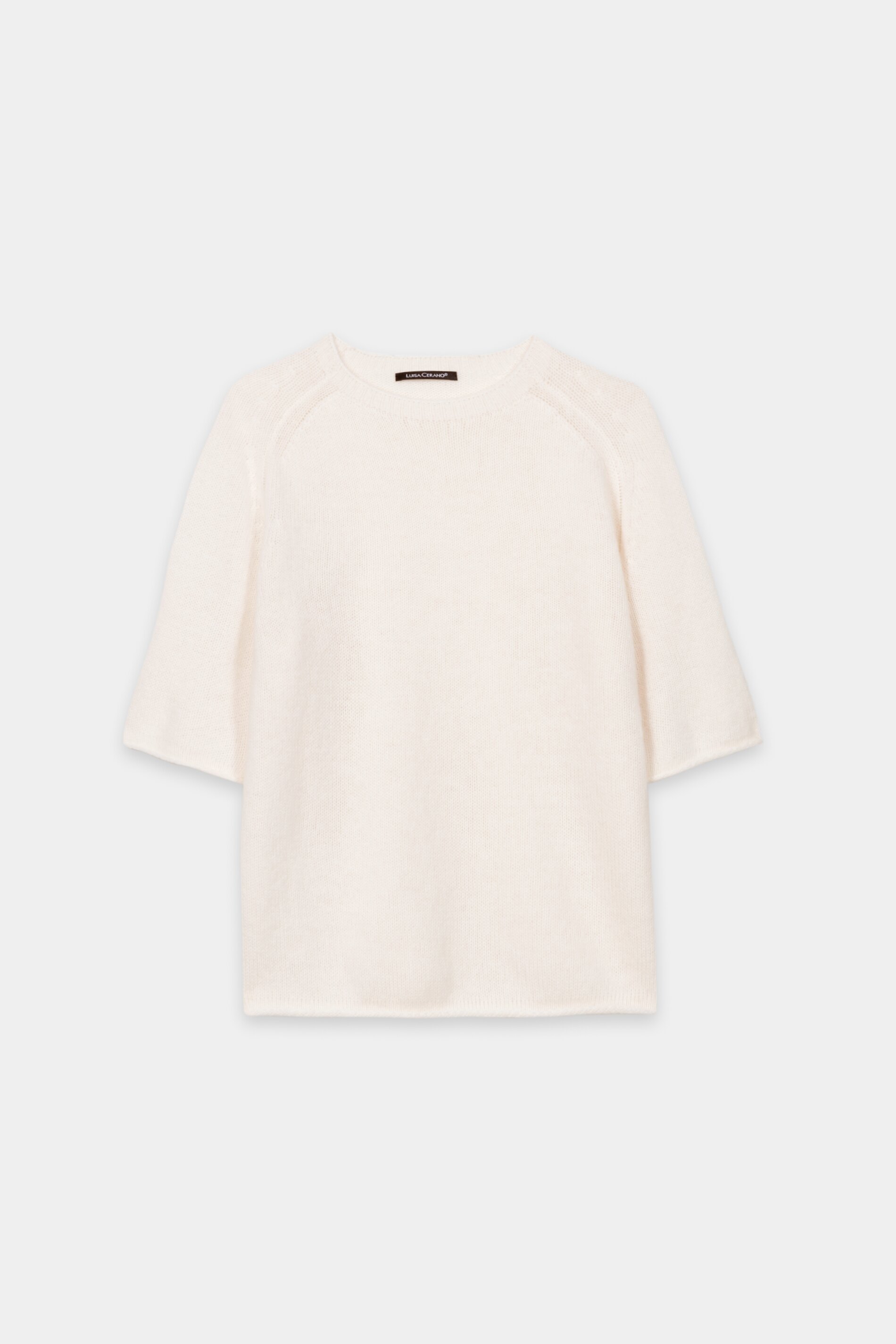 Ein luxuriös weicher Strickpullover von Luisa Cerano aus einer feinen Kaschmir-Mischung, der durch seinen kastigen Schnitt eine moderne Leichtigkeit ausstrahlt. Die kurzen Ärmel, der sanfte Rundhalsausschnitt sowie die feinen Minderungsdetails verleihen dem Design eine elegante Zurückhaltung. Die Abschlüsse sind mit einem dezenten Rollsaum versehen, was dem Pullover eine weiche, fließende Kontur gibt. Durch seine leicht offene Saumgestaltung fällt er besonders schön und harmonisch – ein zeitloses Essential, das sich mühelos in jede Garderobe einfügt. Die Farbe Cream unterstreicht den edlen Charakter und lässt sich vielseitig kombinieren.