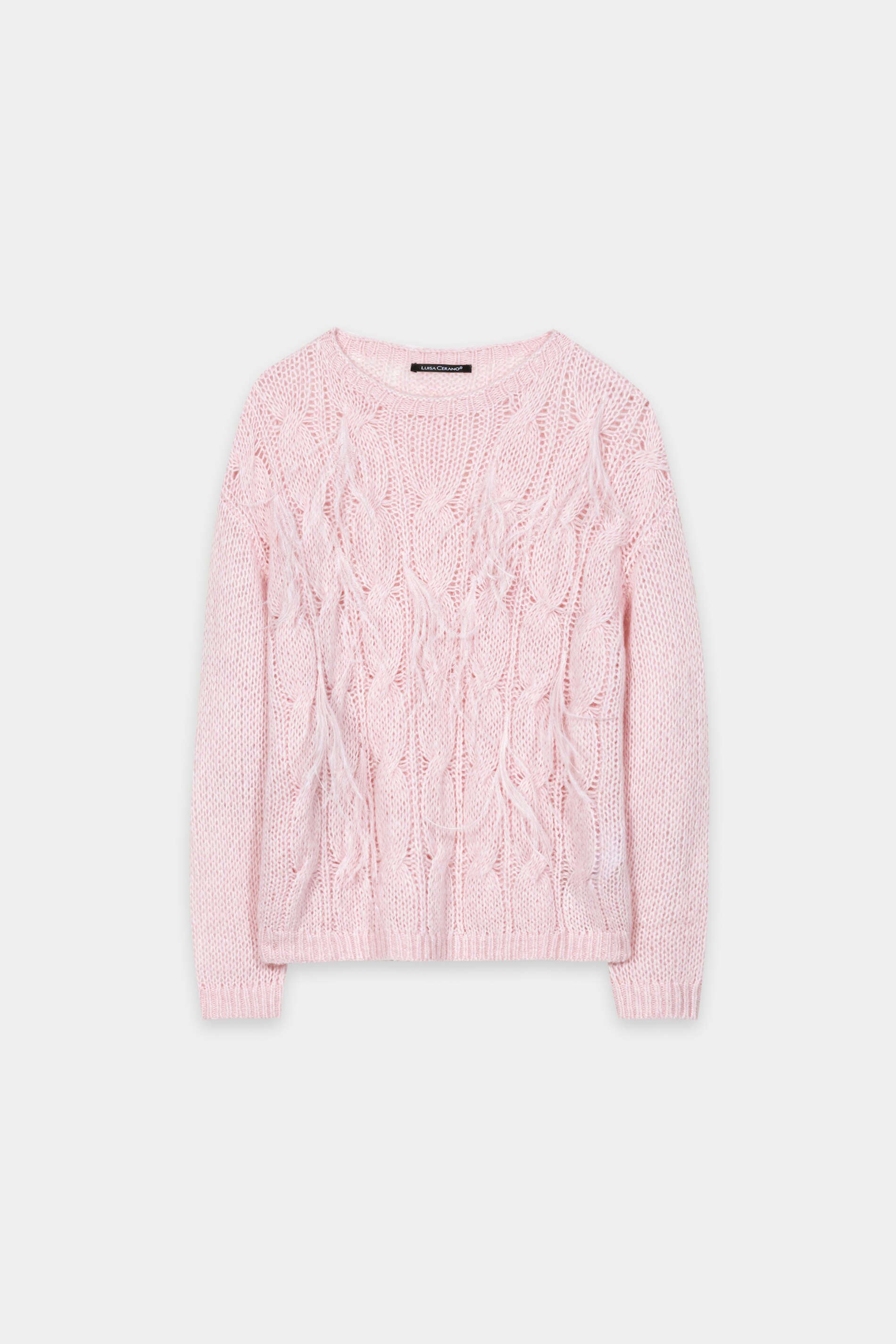 Ein außergewöhnlich weicher, federleicht gestrickter Pullover vom Luisa Cerano in luftiger Air-Spun-Verarbeitung, der mit seinem aufwendigen Zopfmuster sofort begeistert. Die besondere Alpaka-Wollmischung sorgt für ein angenehm weiches Tragegefühl, während der Rundhalsausschnitt den Look klassisch abrundet. Für ein einzigartiges Highlight sorgen die in Handarbeit applizierten Federn vom Strauß und vom Hahn, die dem Pullover eine exklusive, feminine Note verleihen. Dezente Rippstrickbündchen vollenden das hochwertige Design.