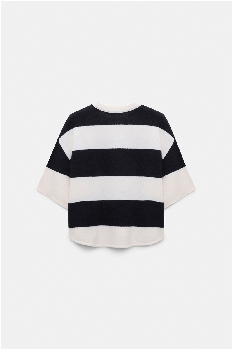 Ein grafisch klarer Pullover im T-Shirt-Style mit subtiler Raffinesse. Der weiche Merino-Kaschmir-Strick fühlt sich angenehm leicht an und fällt locker über den Körper. Breite, ellbogenlange Ärmel und der geschwungene Saum verleihen dem Design eine entspannte, moderne Linie. Die zweifarbigen Blockstreifen wirken ruhig und präzise, während die Trompe-l’Œil-Tasche aus feiner Pointelle ein leises, handwerkliches Detail setzt. Ein reduziertes Statement-Piece, das die moderne Strickhandschrift von Dorothee Schumacher auf den Punkt bringt.